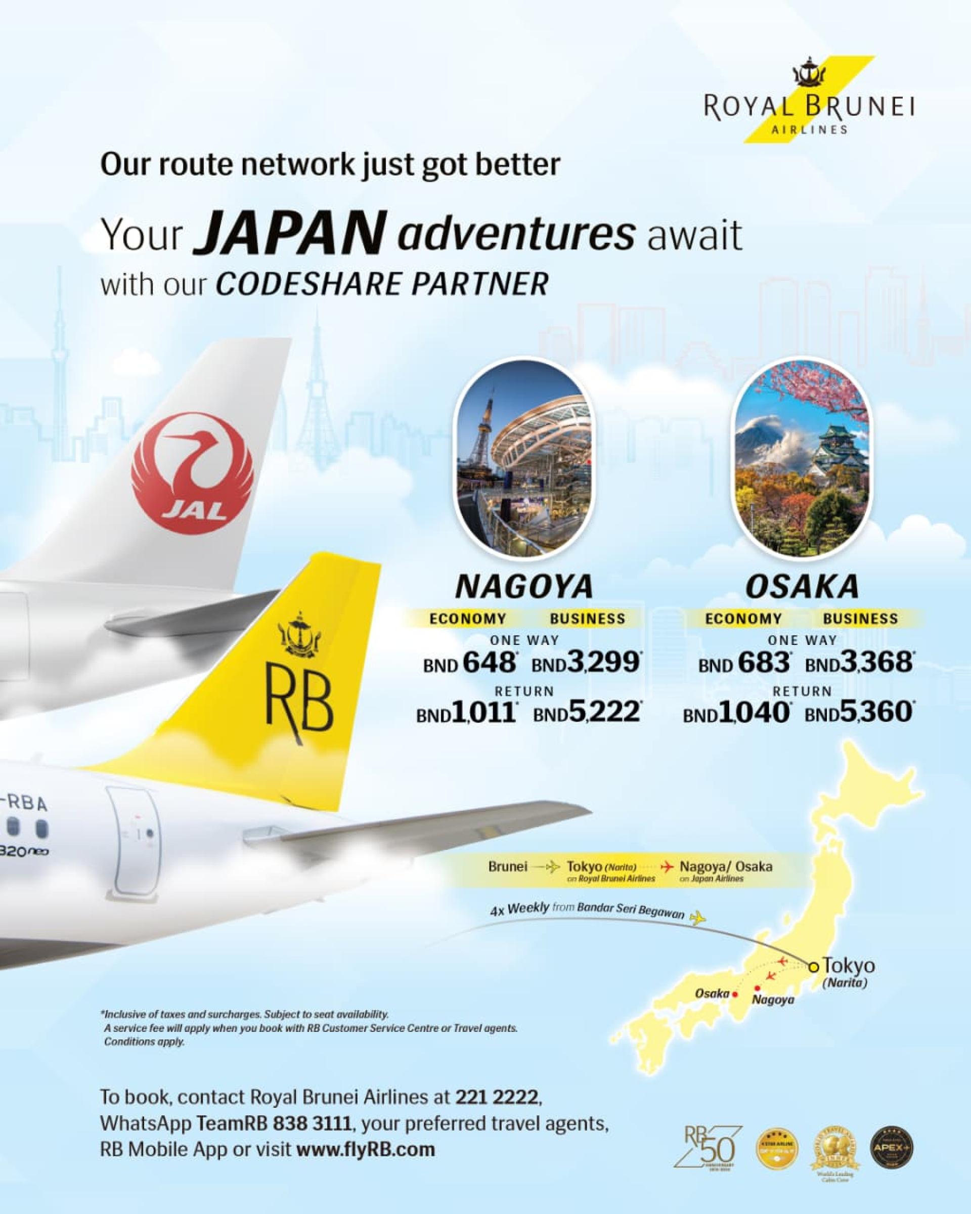 根据协议,两家航空公司可以将各自的航班代码添加到各自运营的指定航线上,为乘客提供更灵活、更顺畅的旅行体验。在代码共享的初始阶段,日航将在其运营的斯市至东京(成田机场)的航班上添加“JL”代码,而汶莱皇家航空将在其运营的日本国内航班上添加“BI”代码,包括大阪和名古屋等主要城市。
