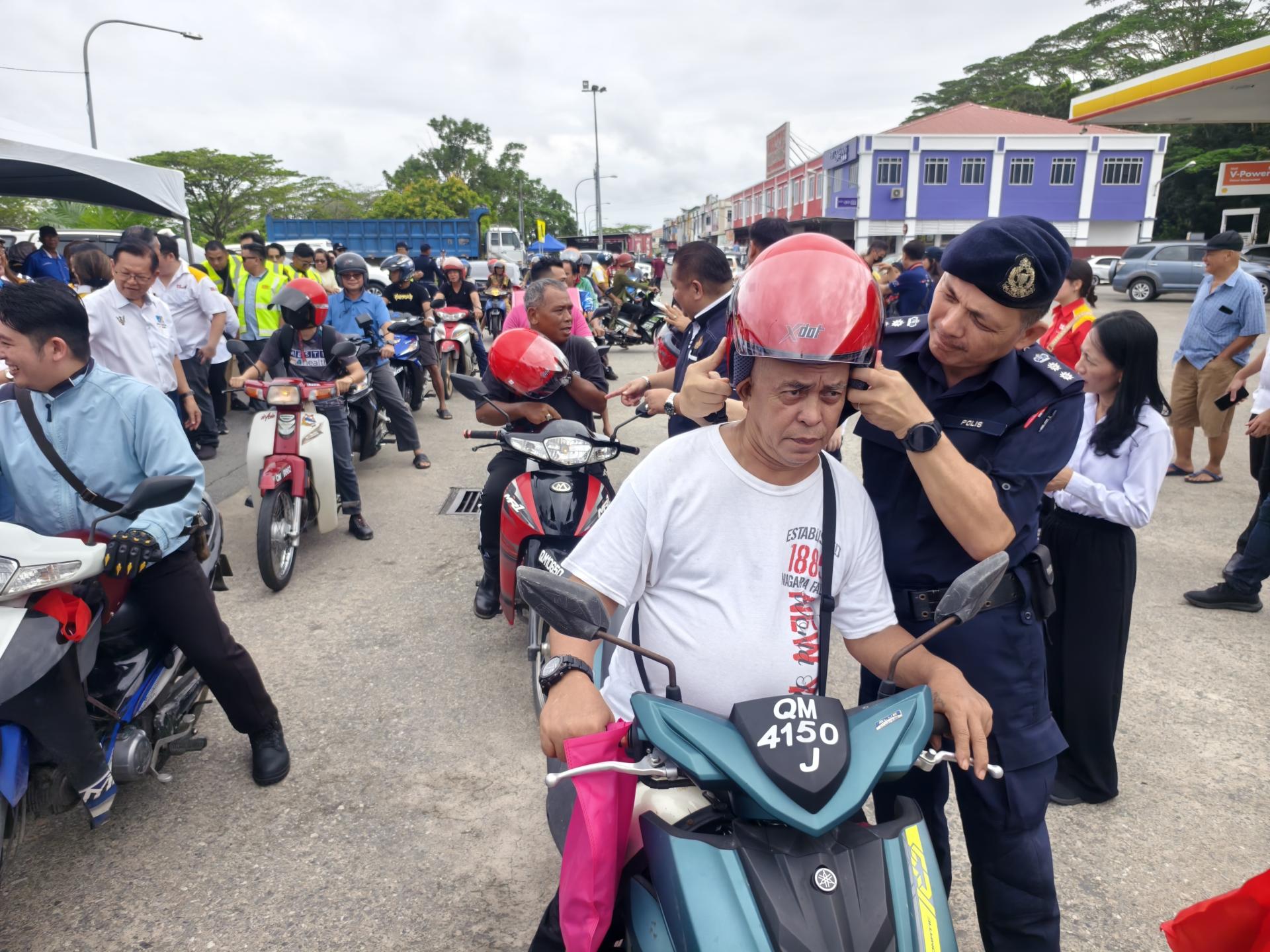 美里省佳节道路安全醒觉运动免费分派头盔,以鼓励摩多骑士及乘客戴上符合大马规格及研究机构(SIRIM) 安全规格的头盔。