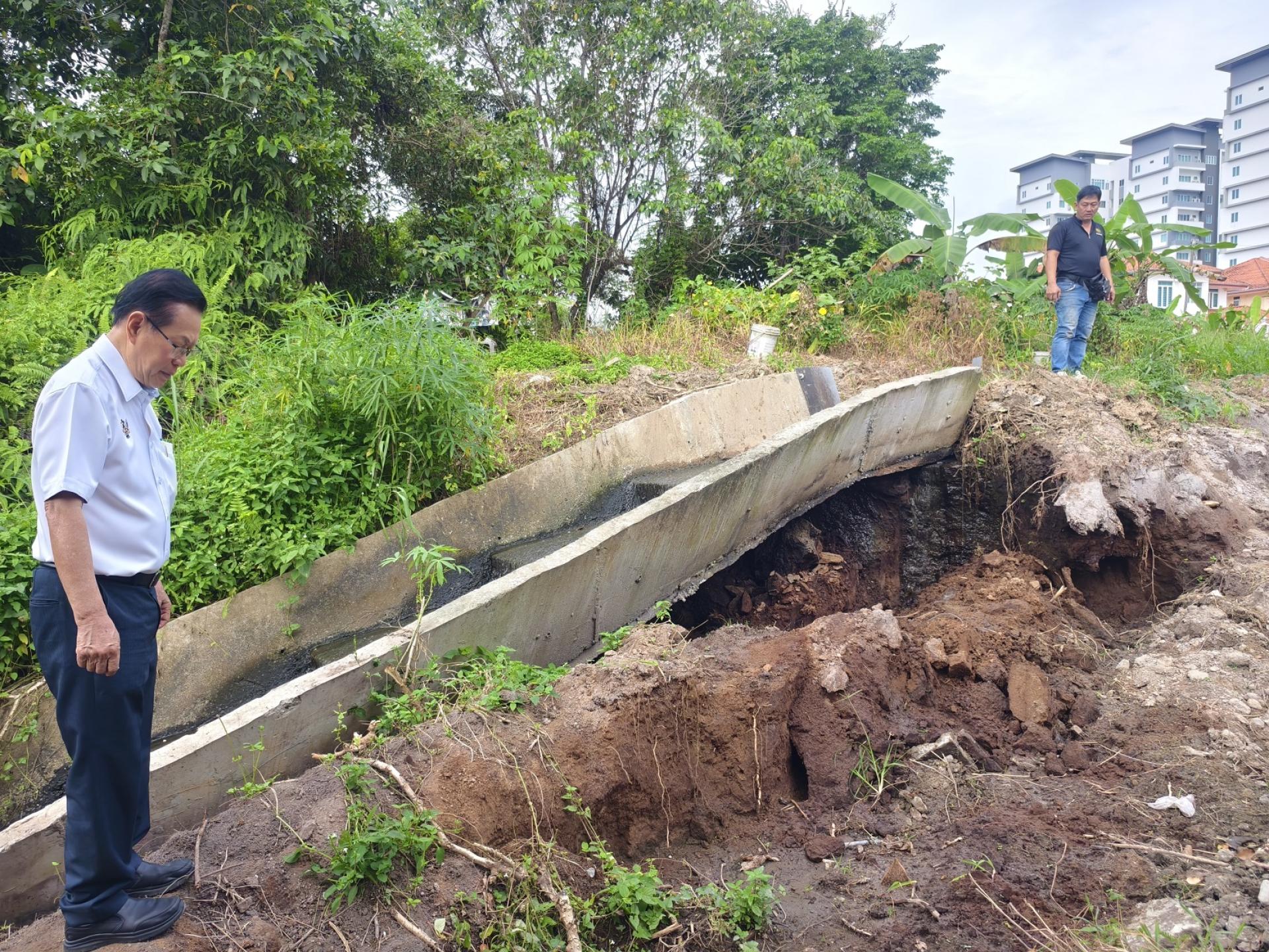 (本报美里26日讯)砂拉越交通部长兼史纳汀区州议员拿督斯里李景胜今早亲自前往廉律路山边,即冠军羽球馆对面一带,巡视当地排水沟因侵蚀而出现坍塌的情况,了解现场安全隐忧及修复需求。