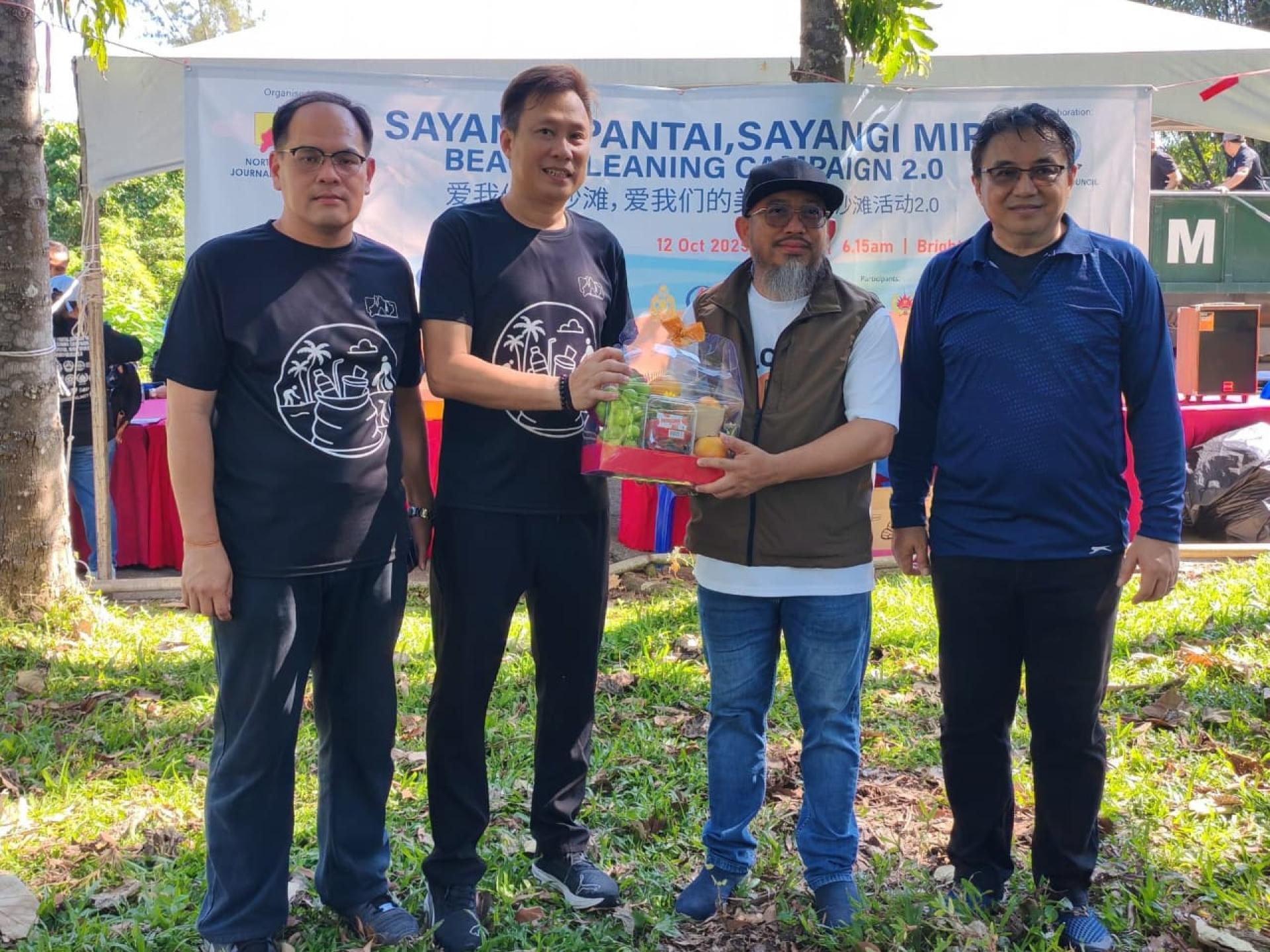 北砂新闻从业员协会会长蔡传晋(左2)赠送水果礼篮予美里副市长阿里芬,左为筹备会主席杨万勇,右为美里市政局永续发展目标小组主任兼市议员查米尔。 他指出,保护环境,不只是口号,而是一种行动与生活态度。大家今天齐聚一堂,不仅是清洁沙滩,更是为下一代守护一片洁净的天空与碧蓝的海洋。