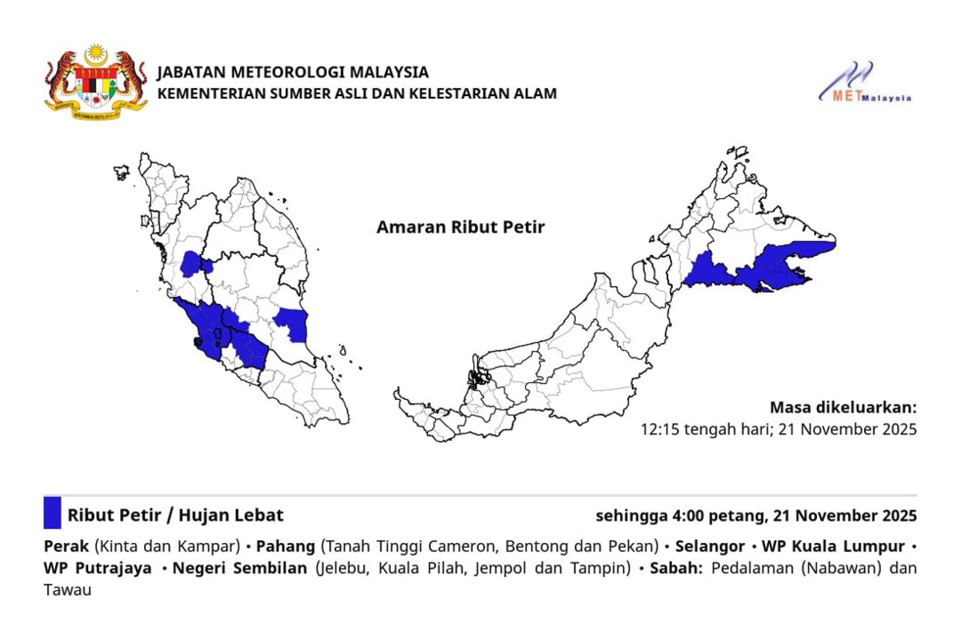 气象局于周五(11月21日)下午12时15分发布气象预警,预计国内大部分地区将出现雷暴雨、强降雨及大风天气,涉及区域包括霹雳州和沙巴州。