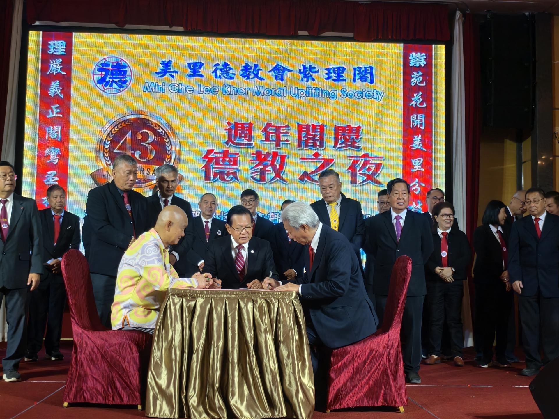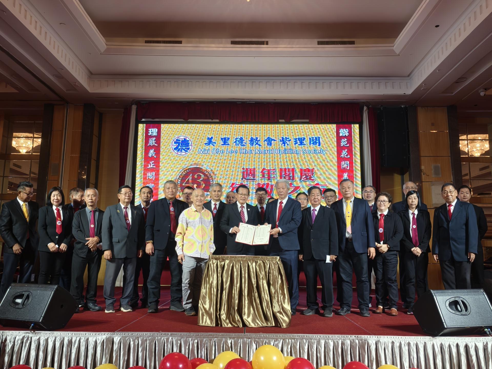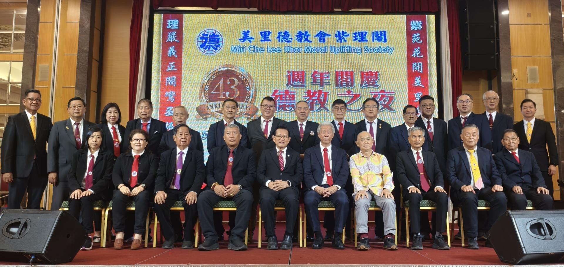 (本报美里27日讯)东马德教联合会第34届理事会宣誓就职典礼,昨晚配合该会成立43周年纪念《德教之夜》晚宴,在美里帝宫大酒店五楼宴会厅隆重举行。大会由美里德教会紫理阁阁长贝清湛接任新届会长。