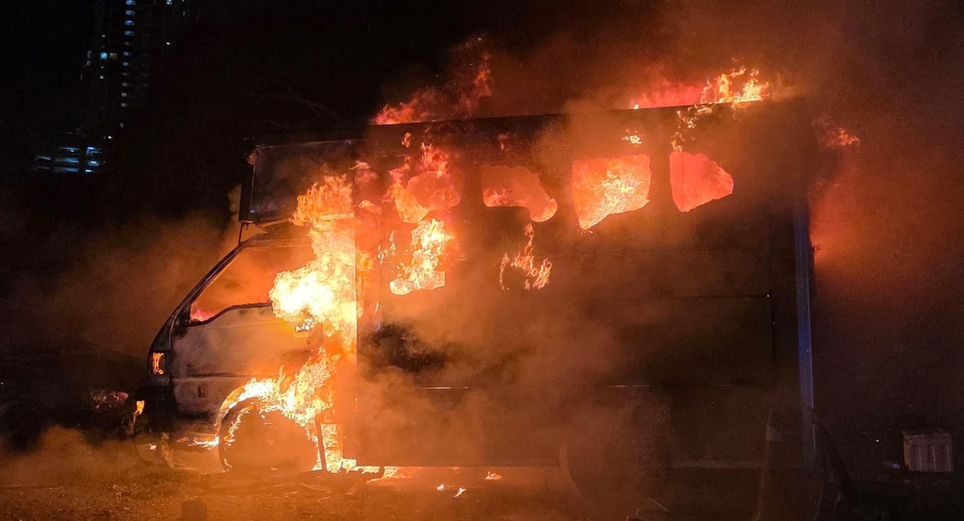 新山一路边贩售烟花爆竹的摊位突然发生火患,大量烟花与爆竹被引燃,殃及一辆餐车被烧毁!