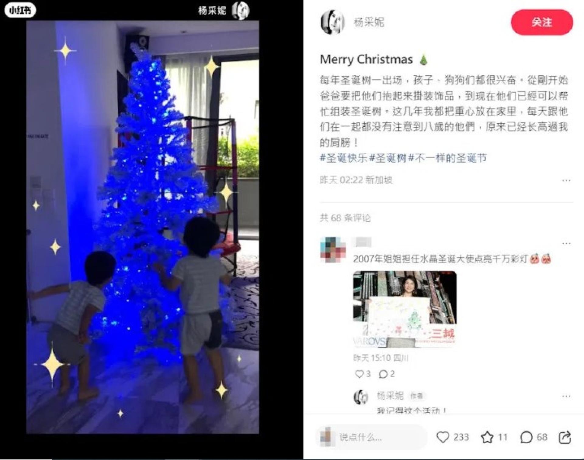 杨采妮在小红书设立账号后发文,并晒出孩子和圣诞树的合照。