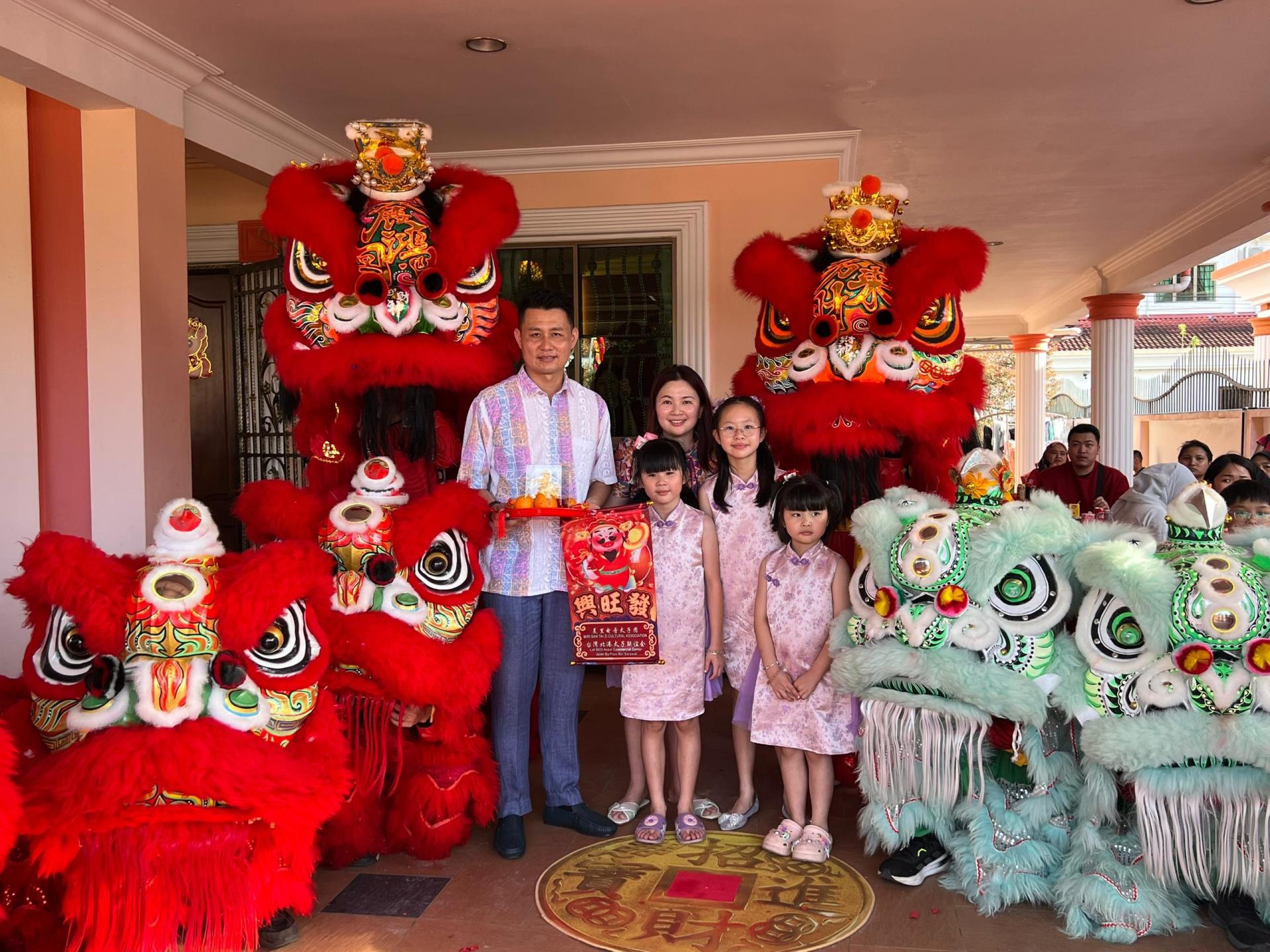 林思健和家人接待美里电音太子团的醒狮道贺,兵祝贺大家新年进步。