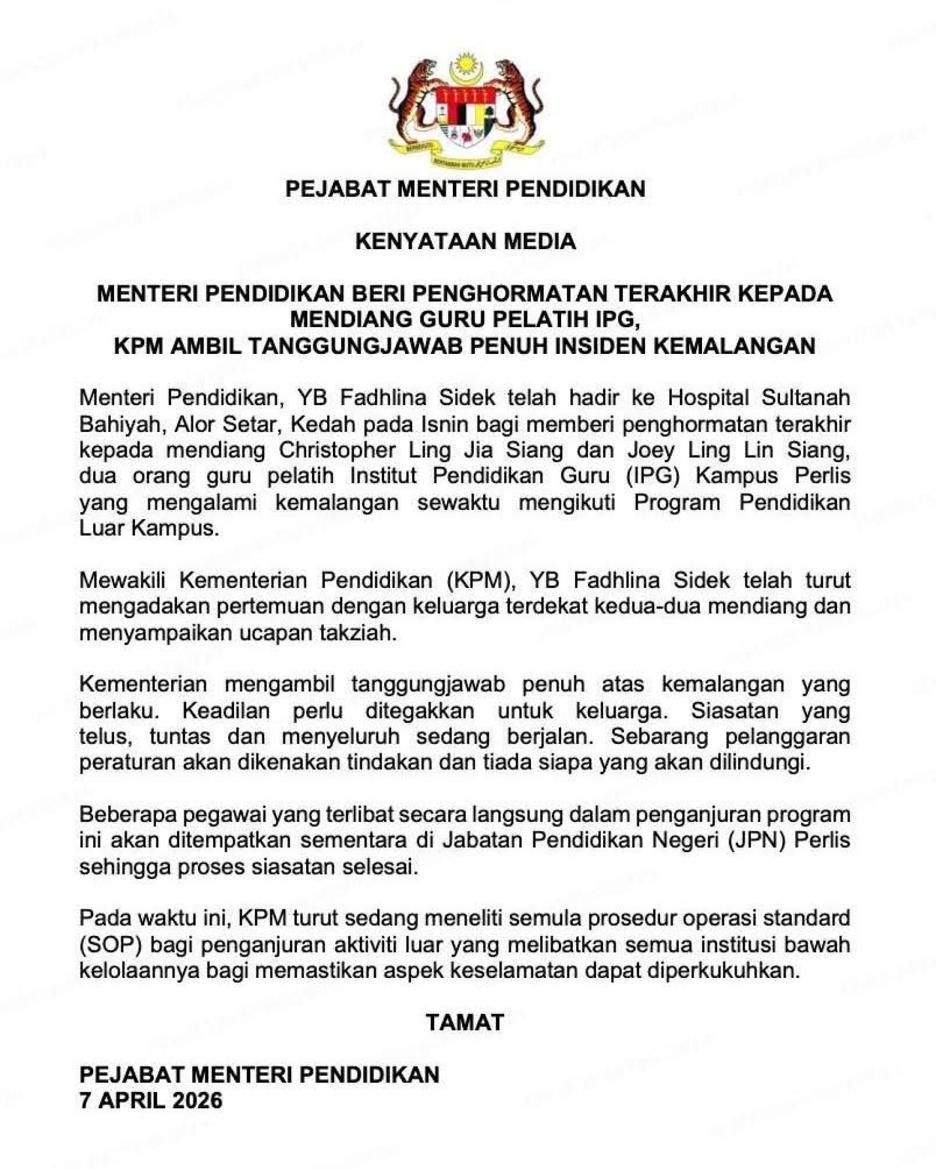 教育部于周二早上在脸书发文告,如是指出。同时,教育部正在重新审视旗下所有机构举办校外活动的标准作业程序,以加强安全措施。(左)林嘉祥(译音)Ling Jia Siang。(右)林玲香(译音)Ling Lin Siang。文告也指出,教育部长法丽娜已于周一亲往亚罗士打苏丹后峇希雅医院,向两名在校外教育课程中遭遇意外丧生的玻璃市师范学院学员致以最后敬意。两名罹难的师训学员分别是林枷城(21岁)以及林菱湘(20岁)。