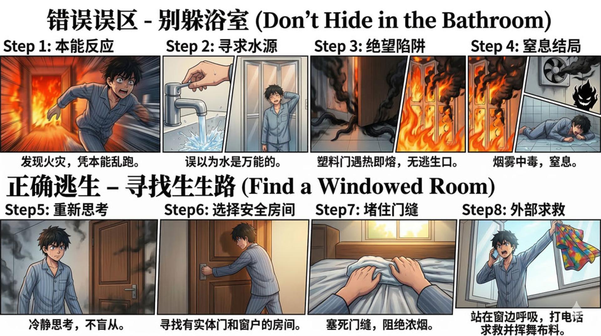 火灾发生时,每一秒都至关重要。记住:浴室不是避难所,及时逃生才是最安全的选择。