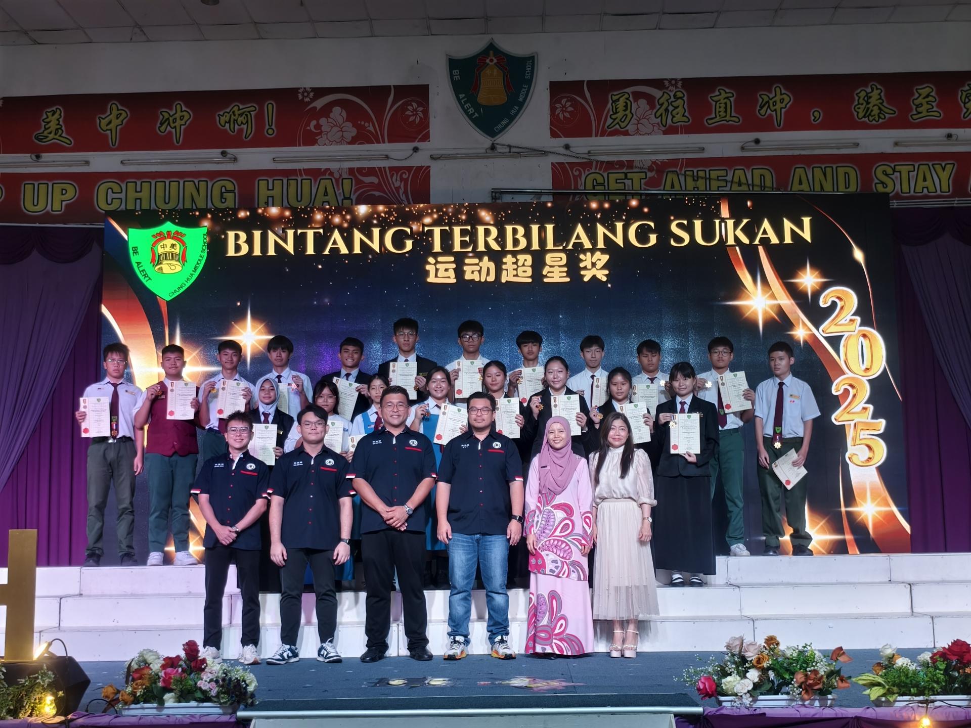 美中运动超星奖得主,与副校长、校友会主席张元德(左4)及成员合影。 他指出,每一份努力,哪怕没有奖杯作为证明,都是个人成长的重要资产。参与本身就是一种胜利,持续努力的成果终将在未来以更美好的方式回馈。