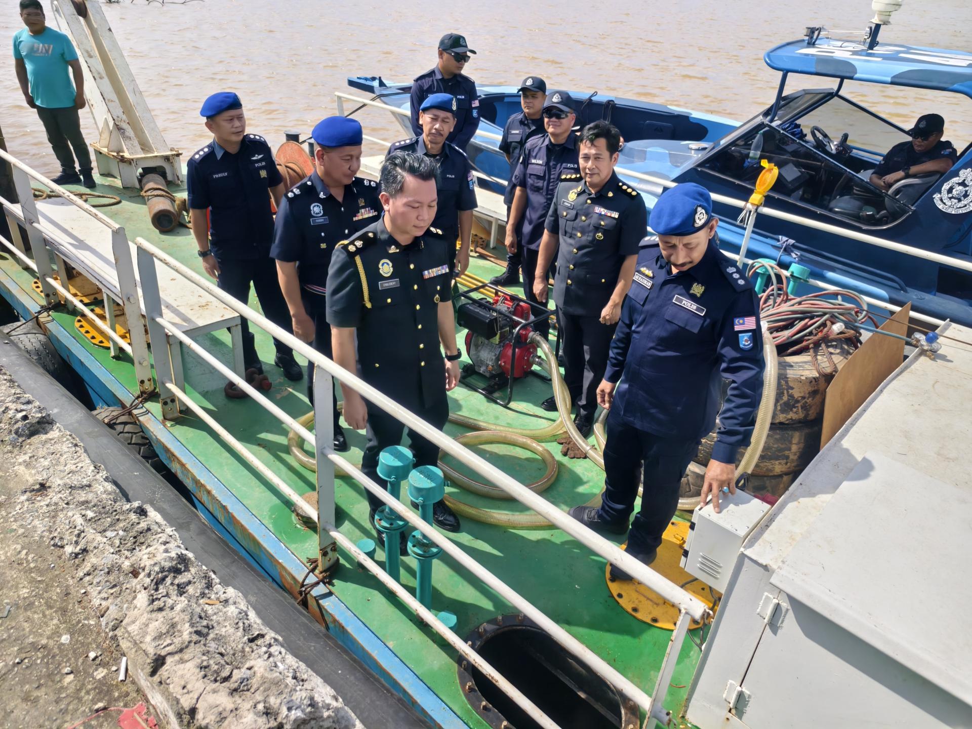 水警巡逻艇PSC44在瓜拉峇南河水域执行任务时,截查涉嫌运载柴油的油槽船。右为砂拉越第5区水警指挥官阿都拉曼助理总监登船检查。