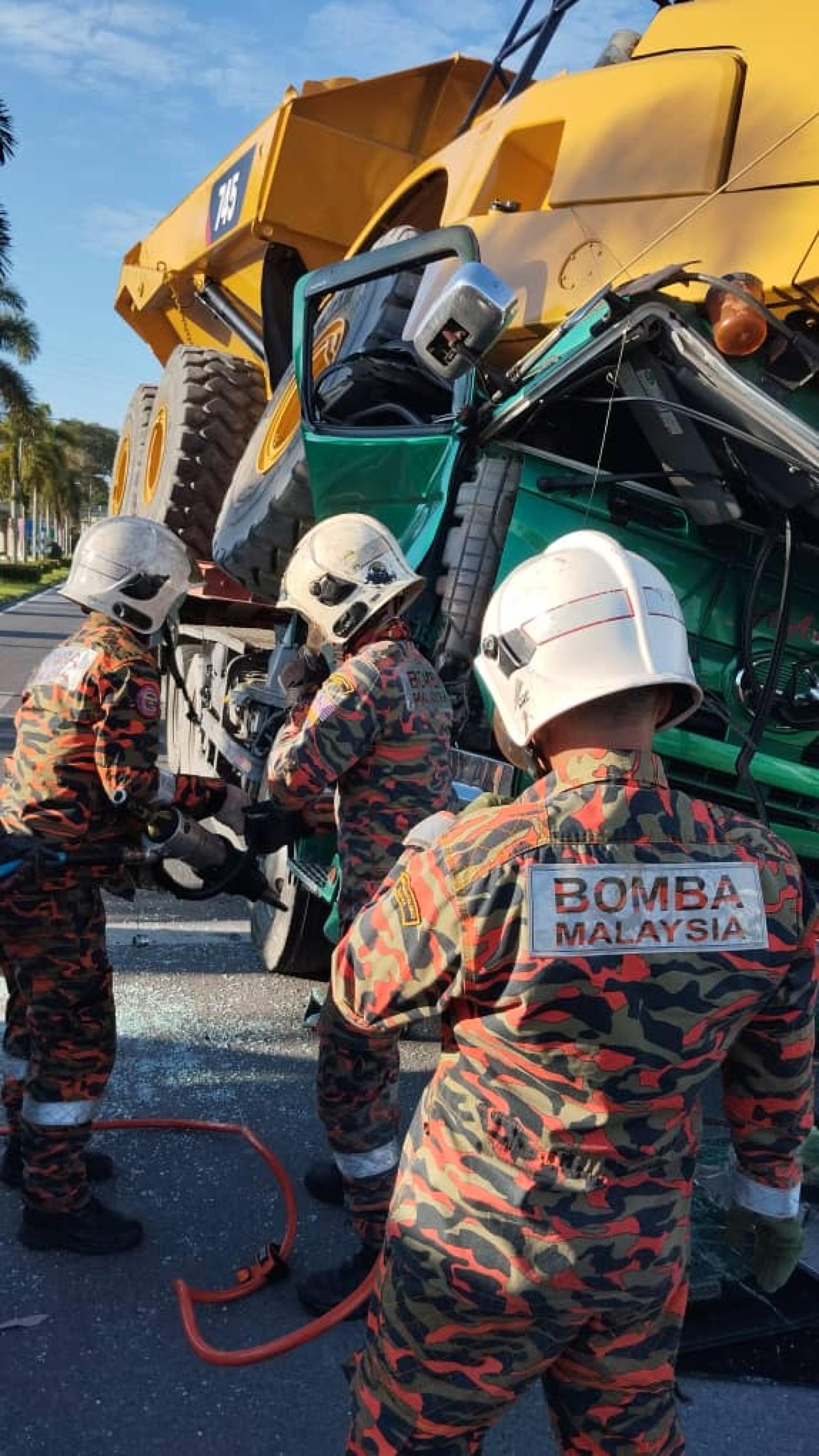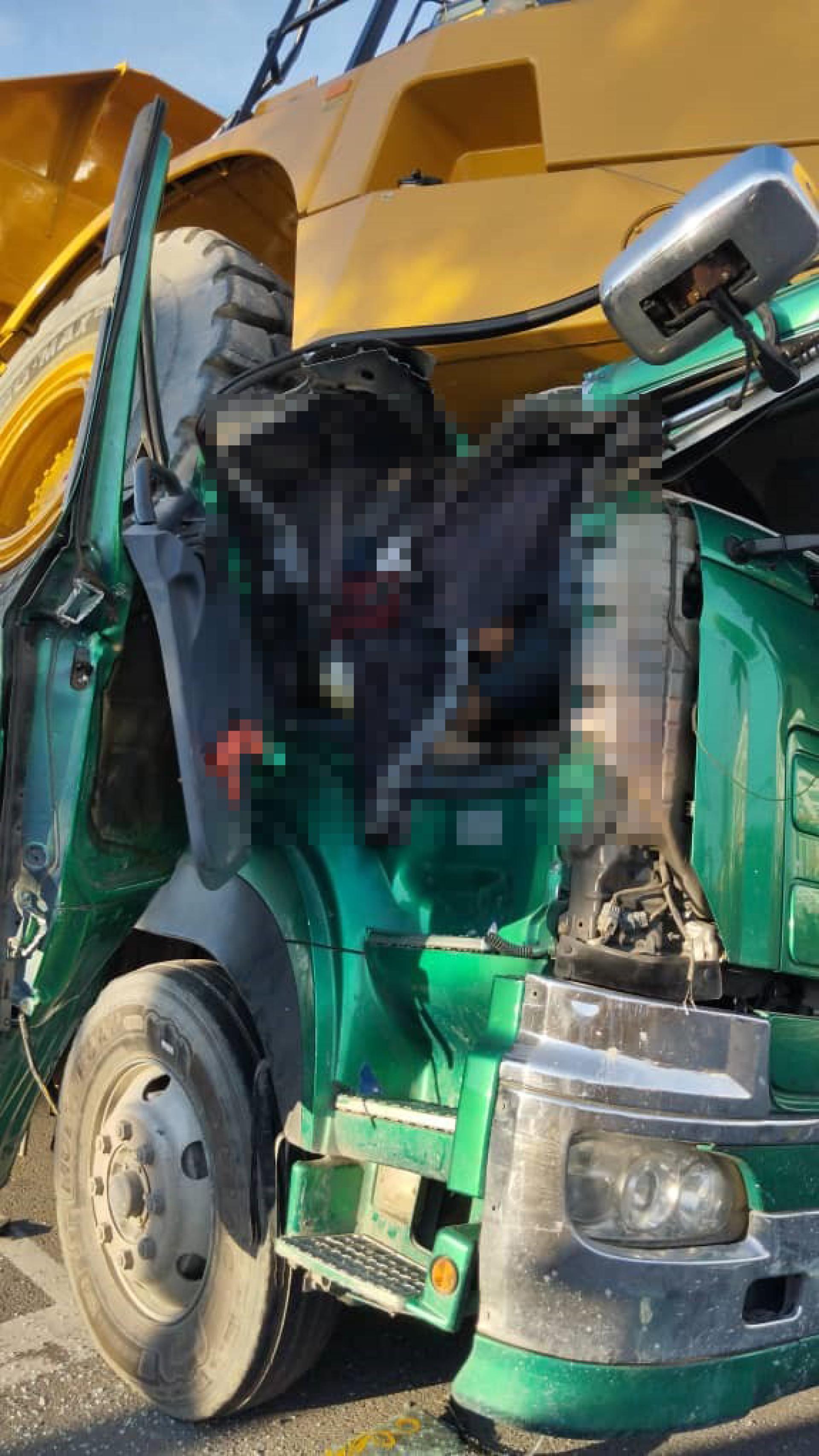 (本报美里3日讯)美里牛场村交通灯路口今午发生严重交通意外,一辆载有重型建筑机械的拖格罗里司机与随车助手双双夹毙驾驶舱内,后证实当场身亡。