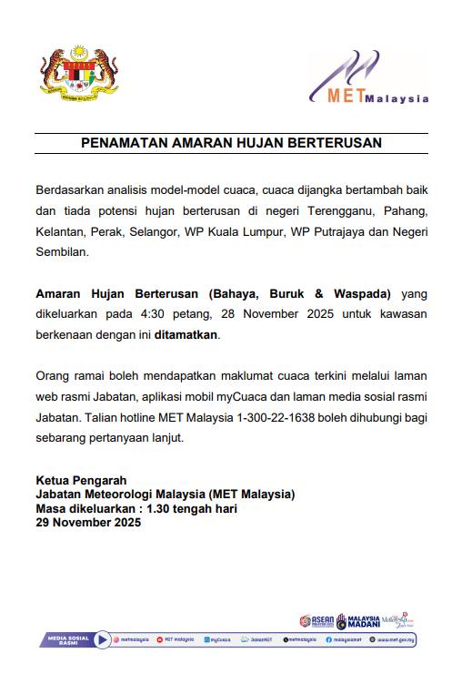 “登嘉楼、彭亨、吉兰丹、霹雳、雪兰莪、吉隆坡联邦直辖区、布城联邦直辖区及森美兰州均不再有持续降雨的潜在风险。”