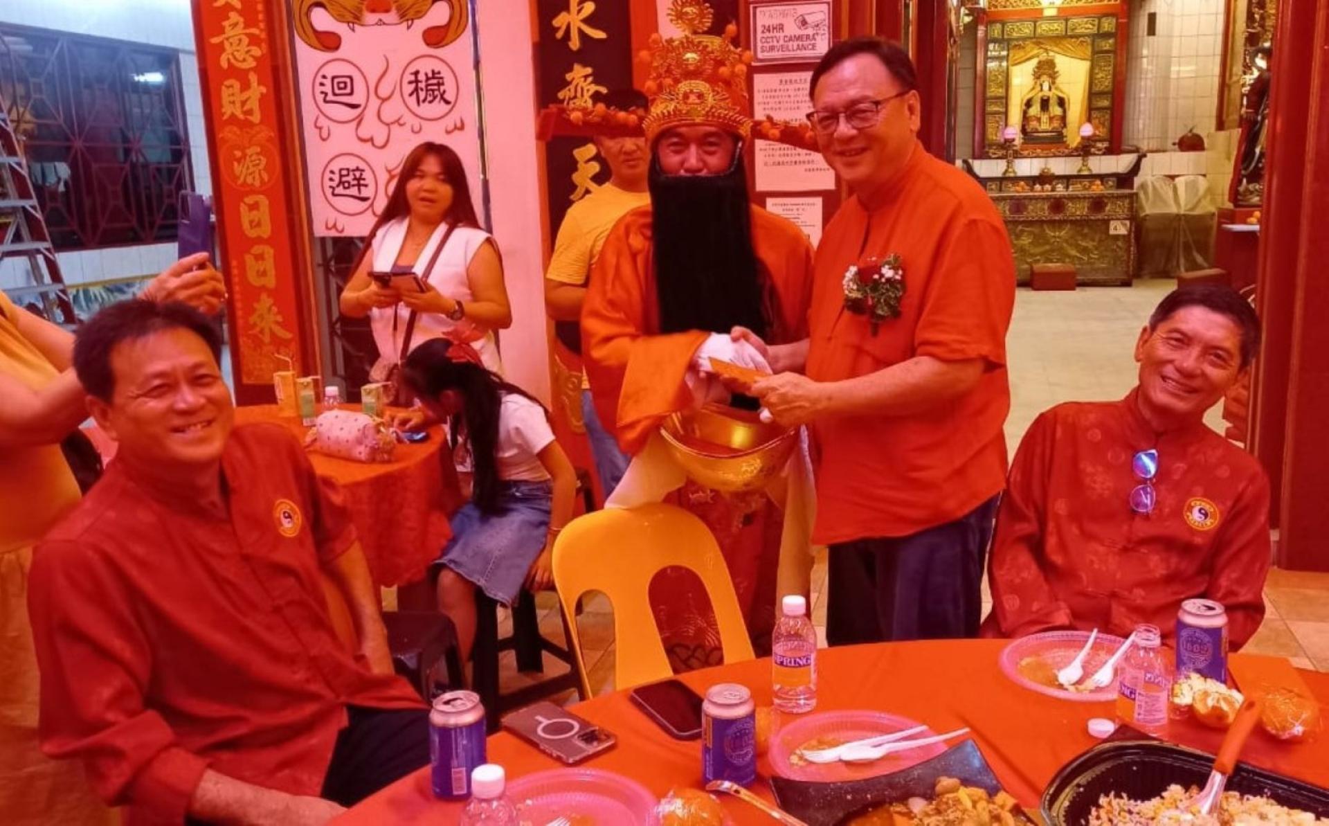 拿督罗克强(右2)在古晋东嶽观新春团拜由“财神爷”手中接过祈福红包。左是主席方文祥太平局绅;右为筹委主席方明生。