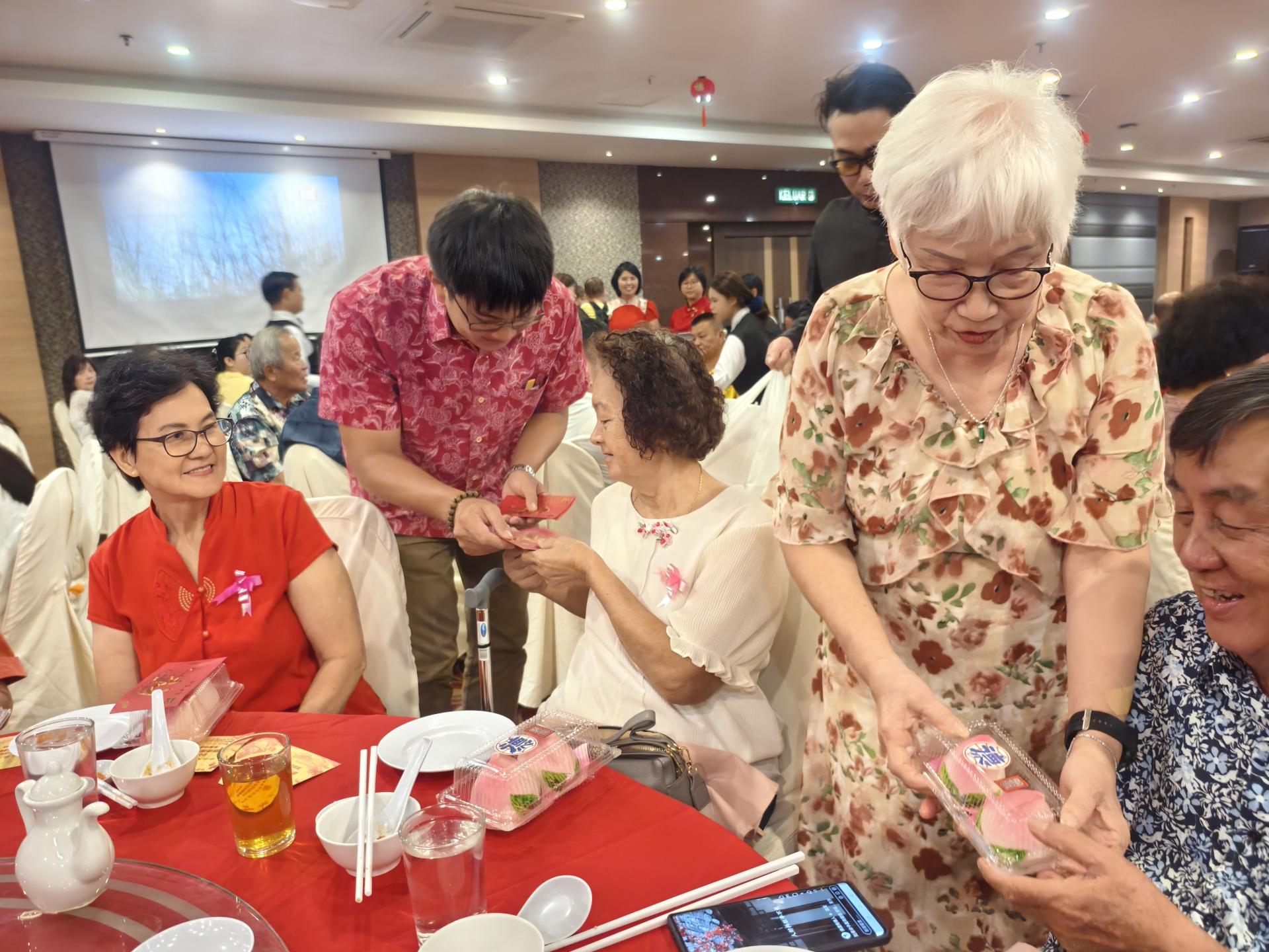 主宾砂旅游副部长拿督陈超耀律师的代表谢家洪及筹备会主席陈兰芳分发红包与寿桃给70岁以上德兄德姐。
