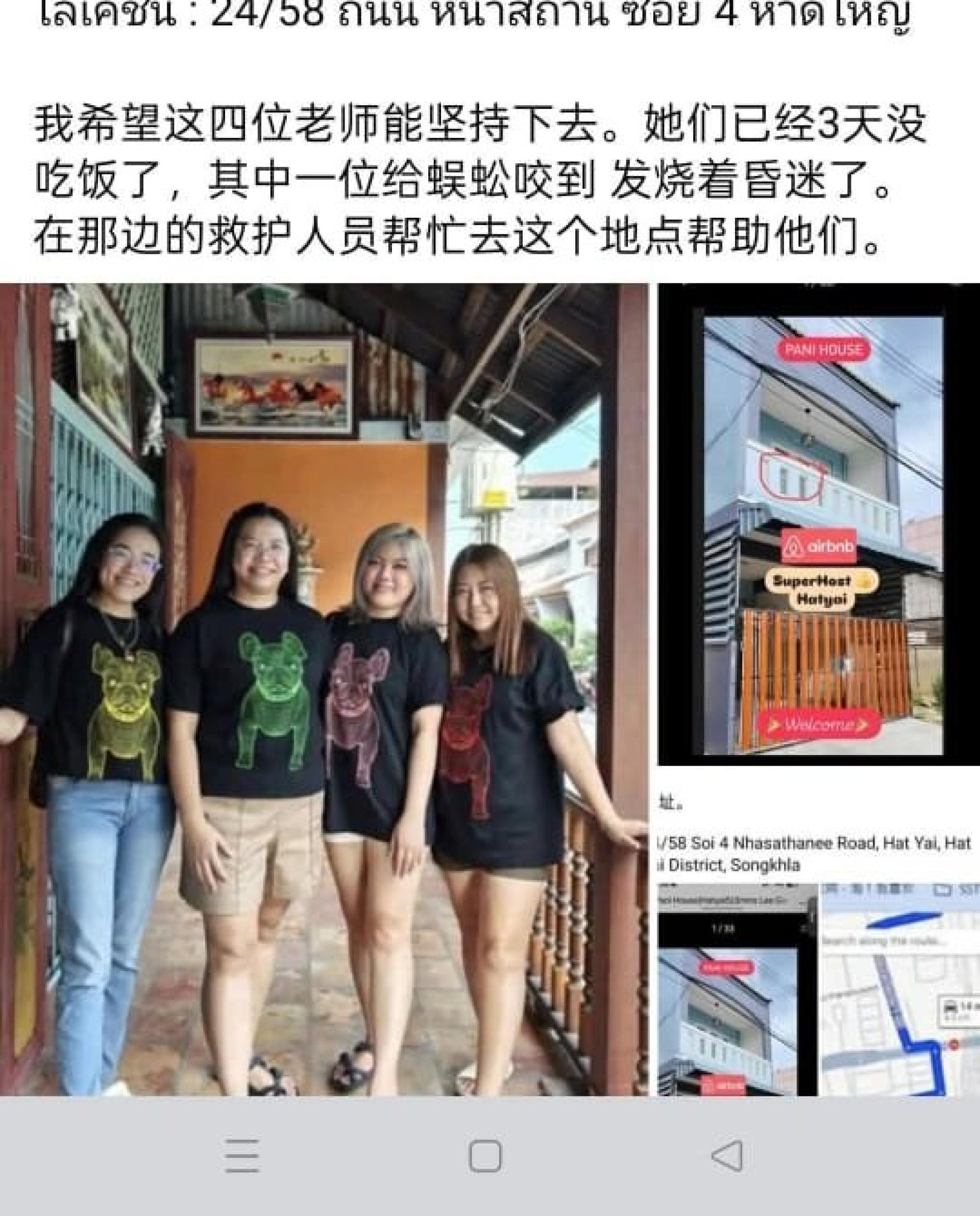 泰国合艾大水灾,早前在社交媒体上流传一则求助贴文称,4名来自居林的老师被困在民宿中,其中一人被蜈蚣咬伤。