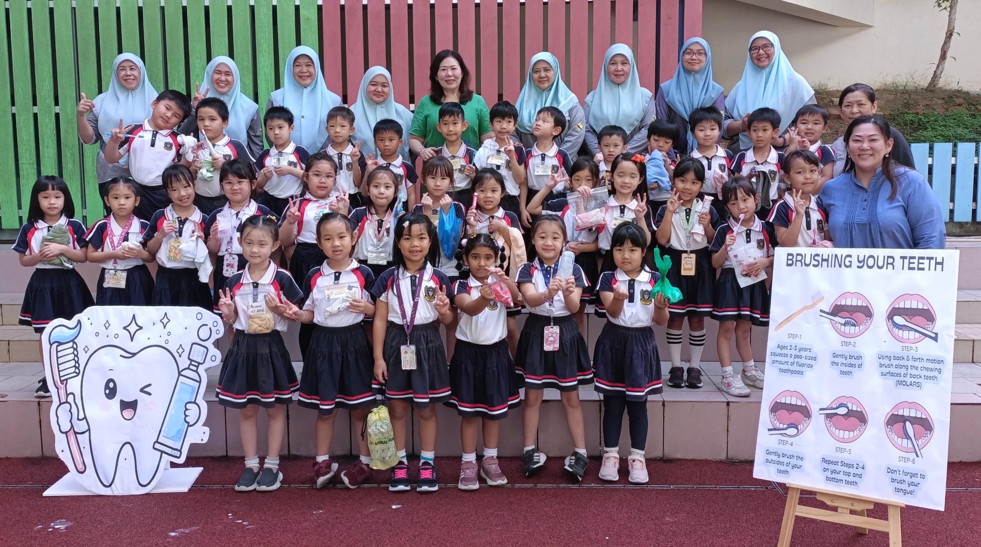 在该校幼儿园近期开展的常年刷牙运动上,全园小朋友积极参与了一场有趣的口腔健康活动。来自汶莱中央医院的8位护士特别为幼三小朋友示范了正确刷牙姿势,并讲解了哪些食物对牙齿有益或有害的知识。