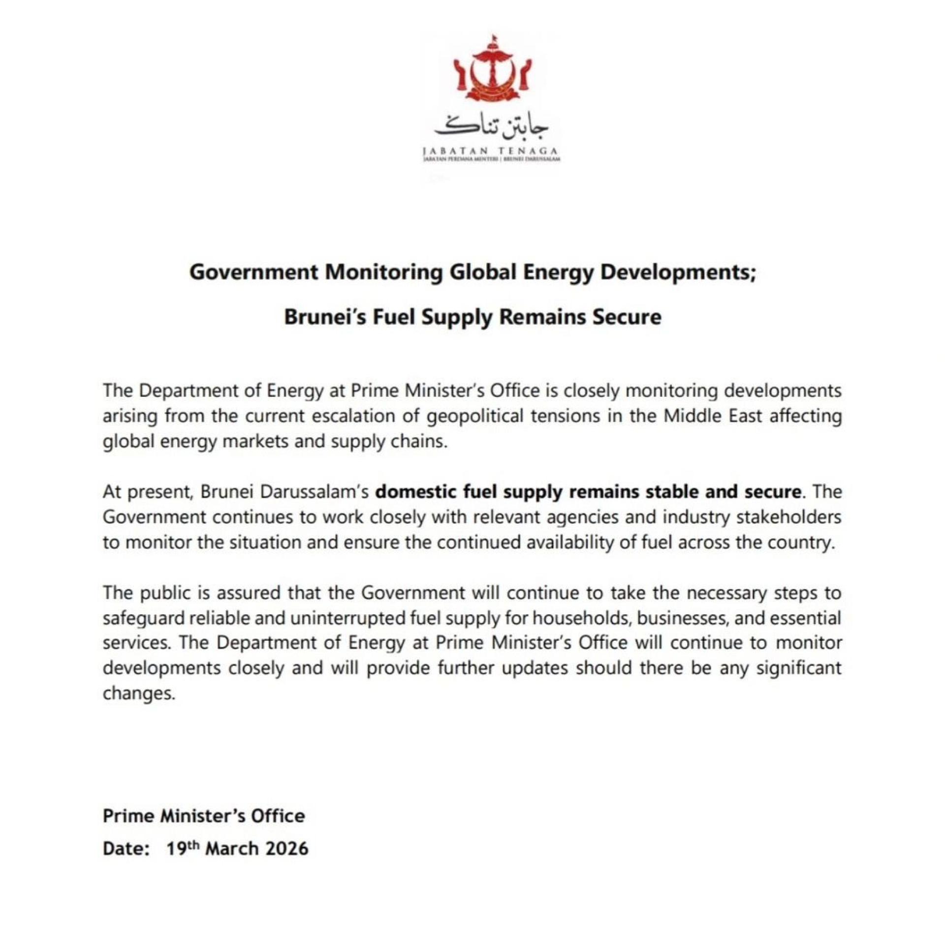 目前,汶莱的国内燃料供应保持稳定和安全,政府重申,汶莱的燃料供应没有受到外部因素的严重干扰。政府表示,正在与相关政府部门和行业利益相关方紧密合作,以确保燃料供应的持续稳定。