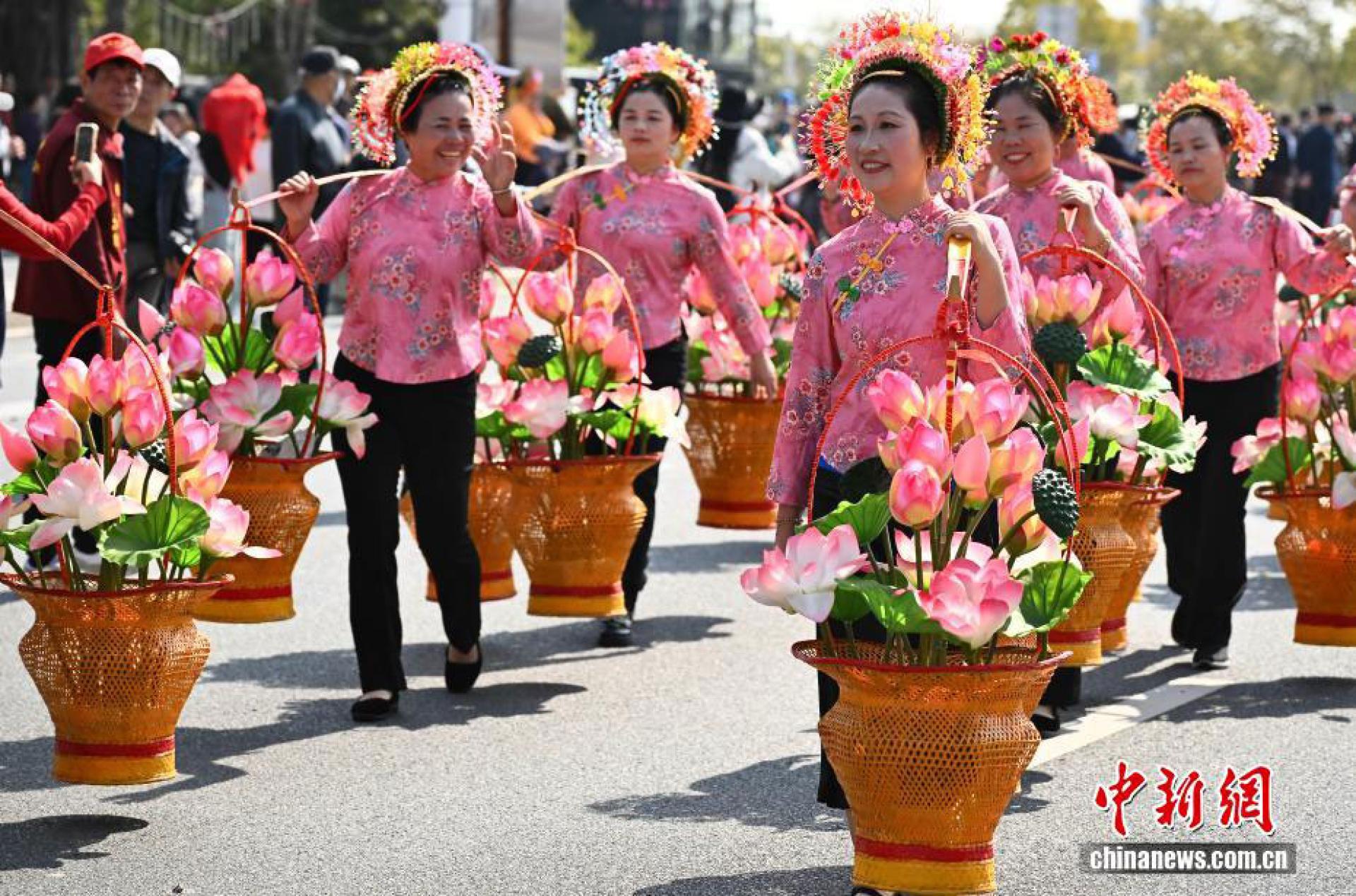 在巡境队列中,蟳埔女们身着大裾衫,头戴“簪花围”,挑着鲜花、果篮、大红灯笼等,成为一道靓丽的风景线。