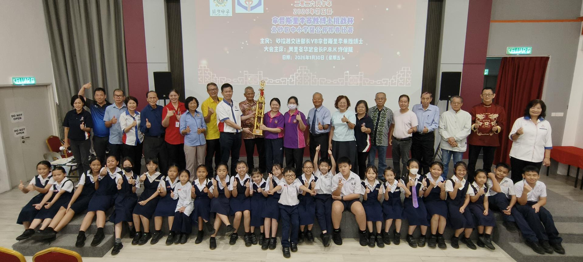 第五届李景胜博士挑战杯挥春赛小学组由美里埔奕中华公学获得,全体师生与颁奖嘉宾合影。 他说,令人感动的是,本届比赛不仅吸引华裔学生踊跃参与,也有许多非华裔同学挥毫竞赛,充分展现砂拉越多元文化社会彼此尊重、共同参与的美好景象,是国家团结与和谐的最佳写照。