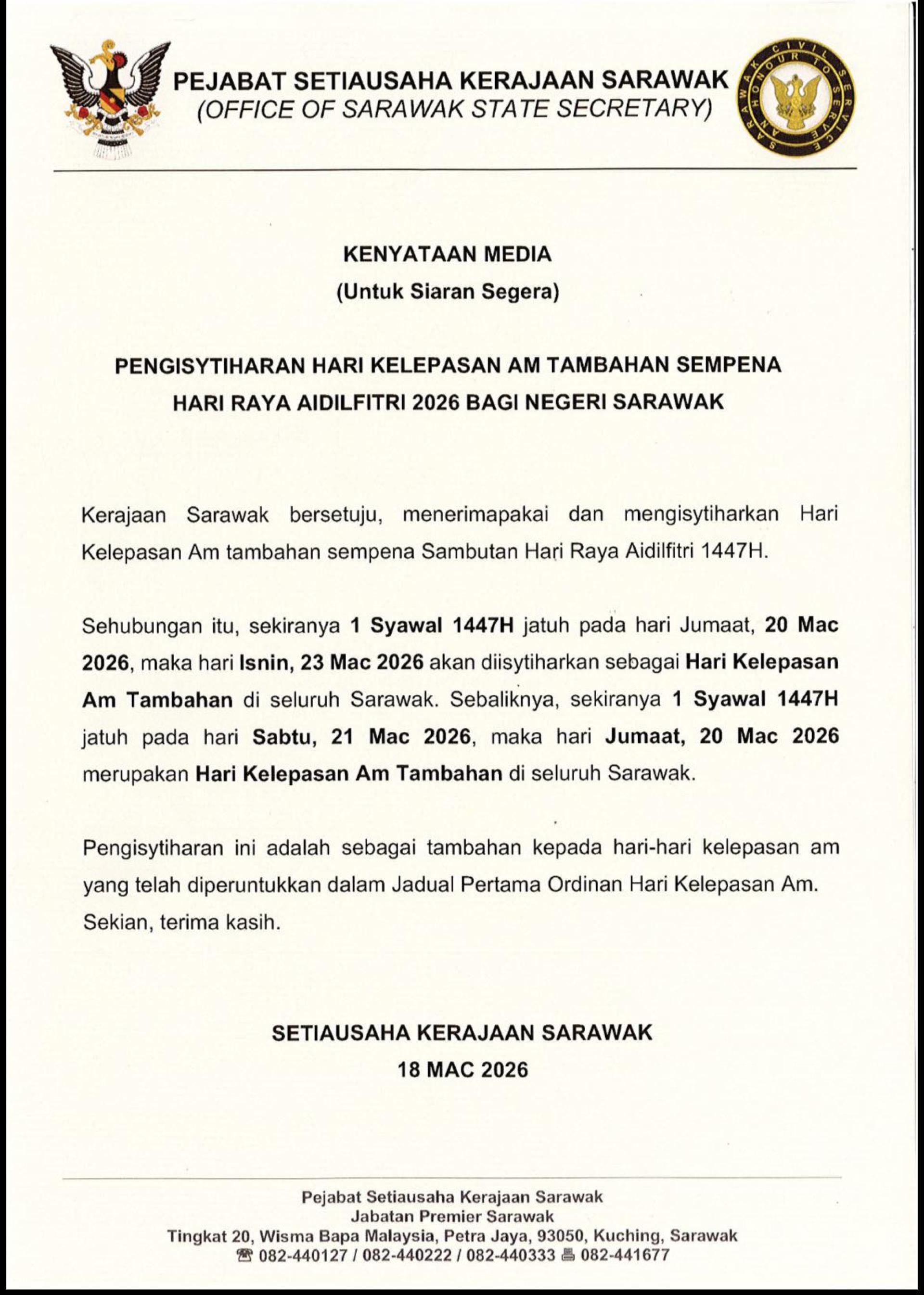 根据砂秘书处今天发布的一项声明中指出,如同首相安华所宣布的一样,倘若开斋节落在周五(20日),那么额外的假期将落在星期一(23日),若开斋节落在周六(21日),额外假期则在周五(20日)。