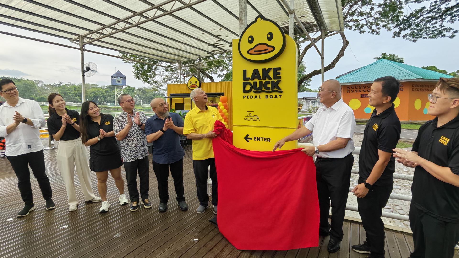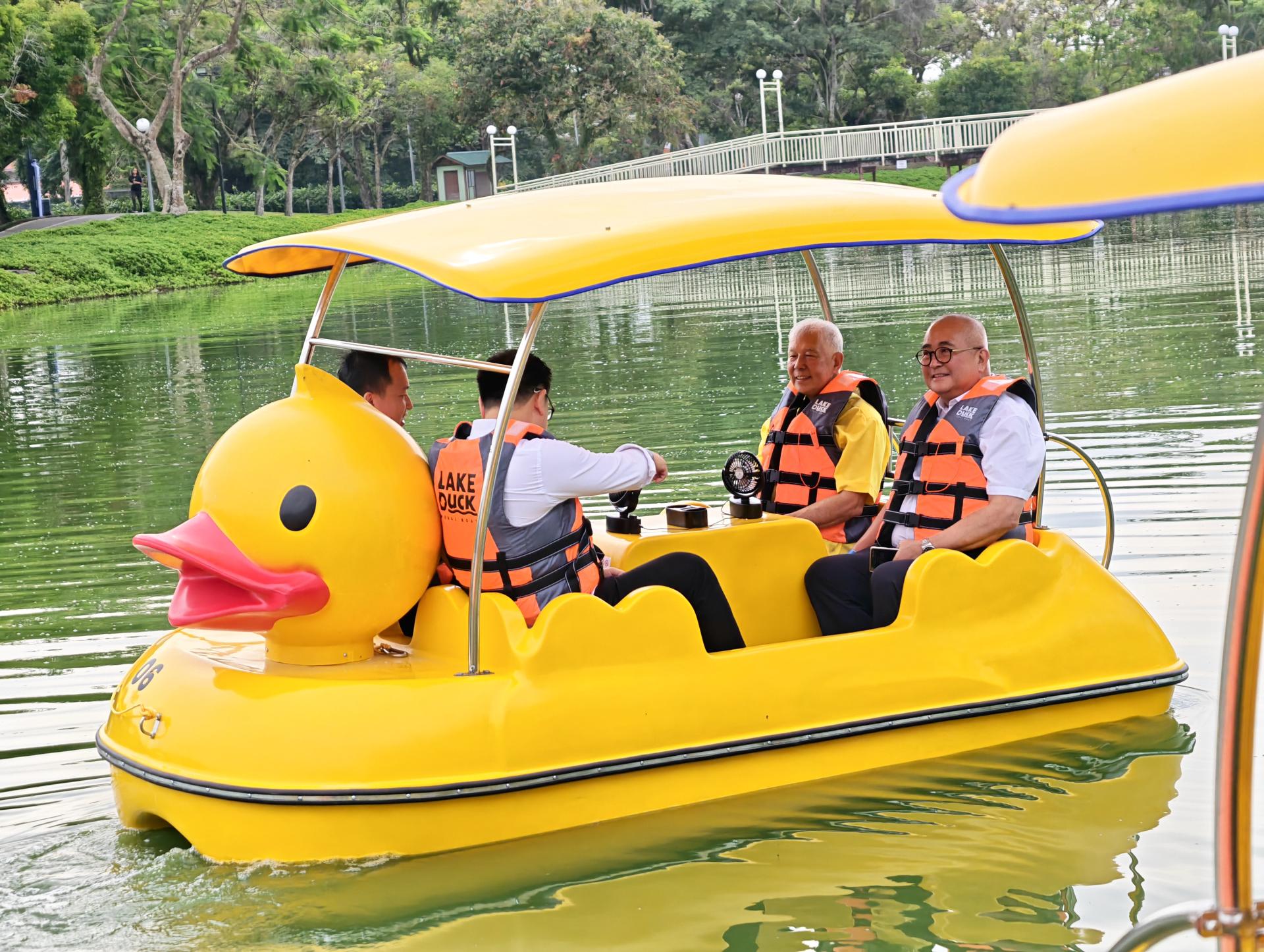 拿督陈超耀(右2)和市长俞小珊(右1)等人体验“黄鸭”湖上脚踏船。