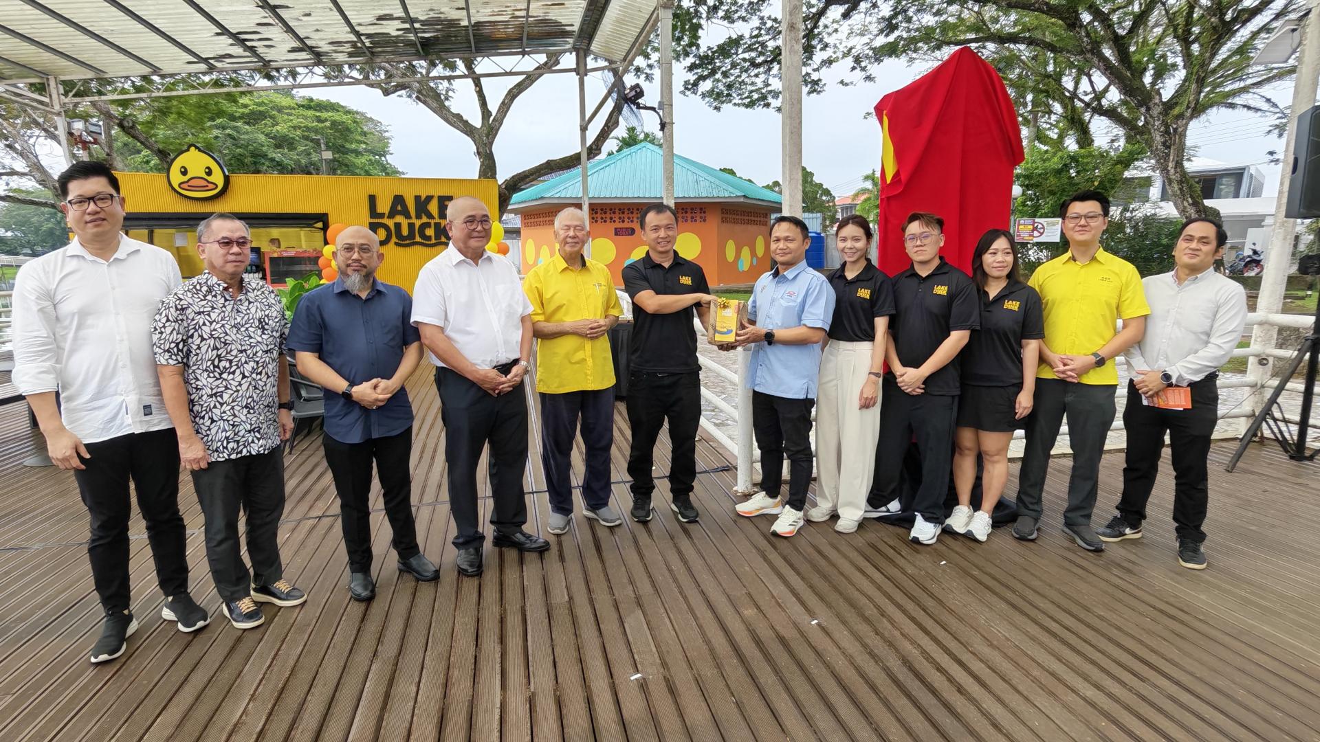 砂拉越旅游部副部长拿督陈超耀(左6)、美里市长俞小珊(右3)为“黄鸭”湖上脚踏船指示牌板主持掀红布仪式。
