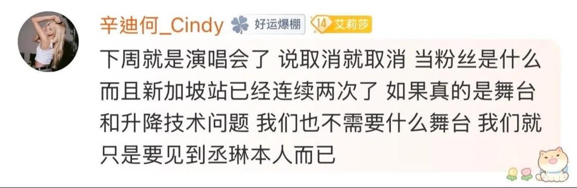 公告还提到,已购票的观众将通过官方售票平台获得全额退款,具体退款流程详情将另行通知。最后,主办方对所造成的不便深表歉意,并感谢歌迷的理解与支持。 实际上,杨丞琳在新加坡的演唱会此前已有取消前例。2024年,她原定于8月24日在新加坡室内体育馆举办“Like A Star世界巡回演唱会”,但演出在两周前宣布取消。当时的主办方星辰娱乐(BT Mediaspace)给出的理由是“因不可抗力的因素于短时间内无法妥善解决”。据悉,星辰娱乐也是此次杨丞琳“房间里的大象”巡演新加坡站的主办方之一。 2024年,杨丞琳原定于8月24日在新加坡室内体育馆举办“Like A Star世界巡回演唱会”,但演出在两周前宣布取消 杨丞琳的演唱会突然再度取消,不仅引发网民对票房问题的猜测,也激怒了期待已久的歌迷。