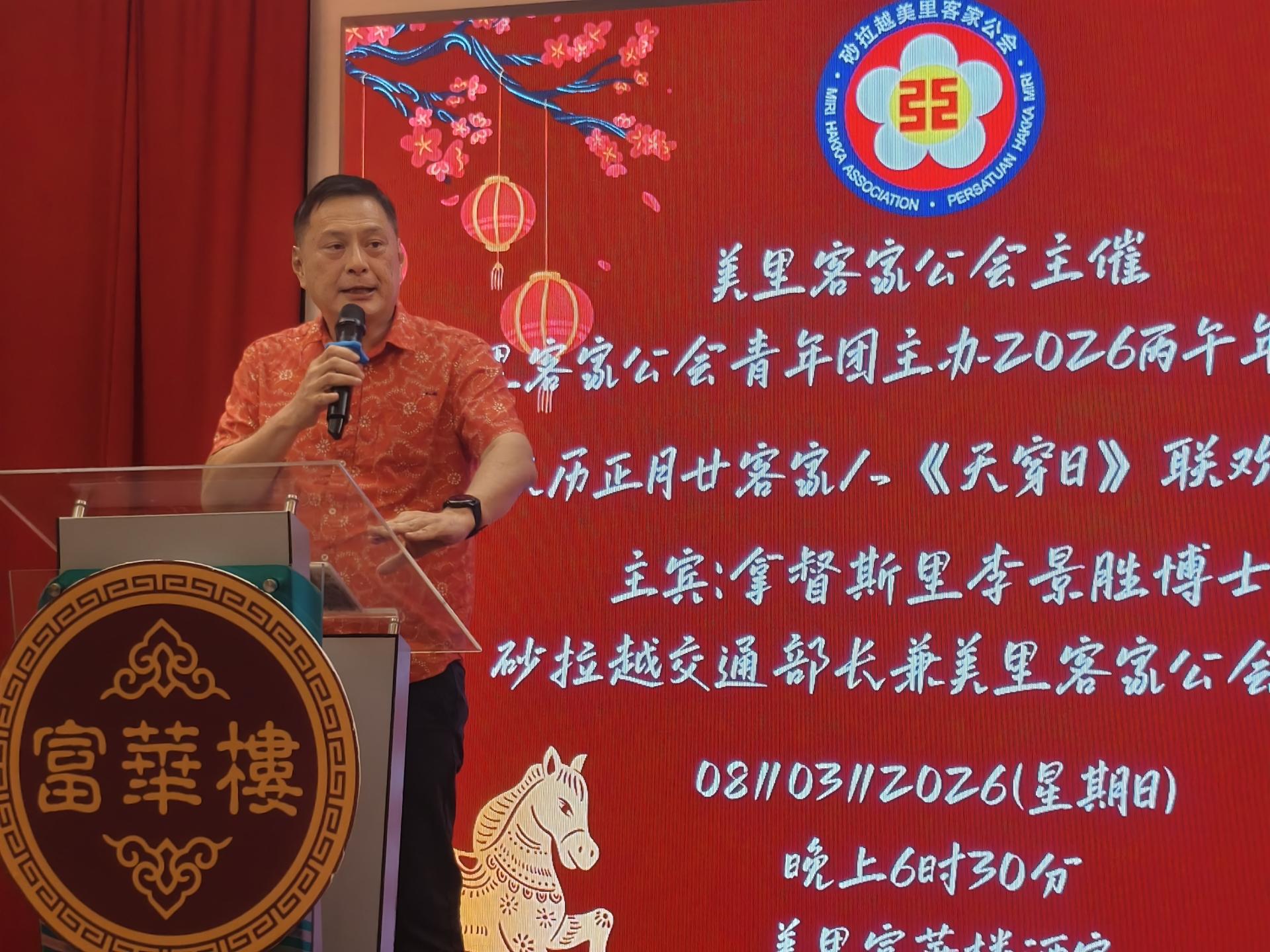 由于江先柱昨晚未克出席由美里客家公会青年团举办的新春兼客家天穿日联欢晚宴,其讲稿由美里客家公会副会长江山河代为宣读。