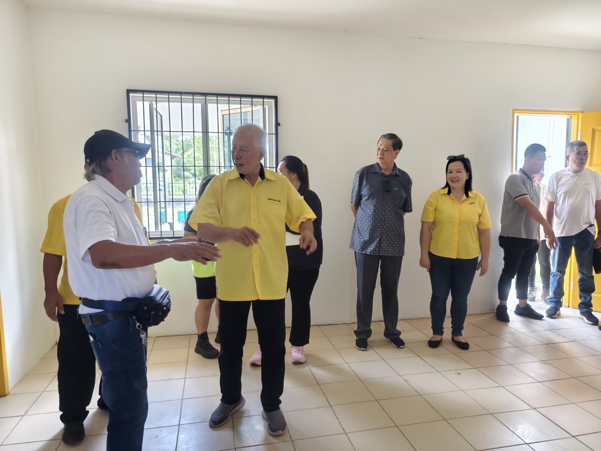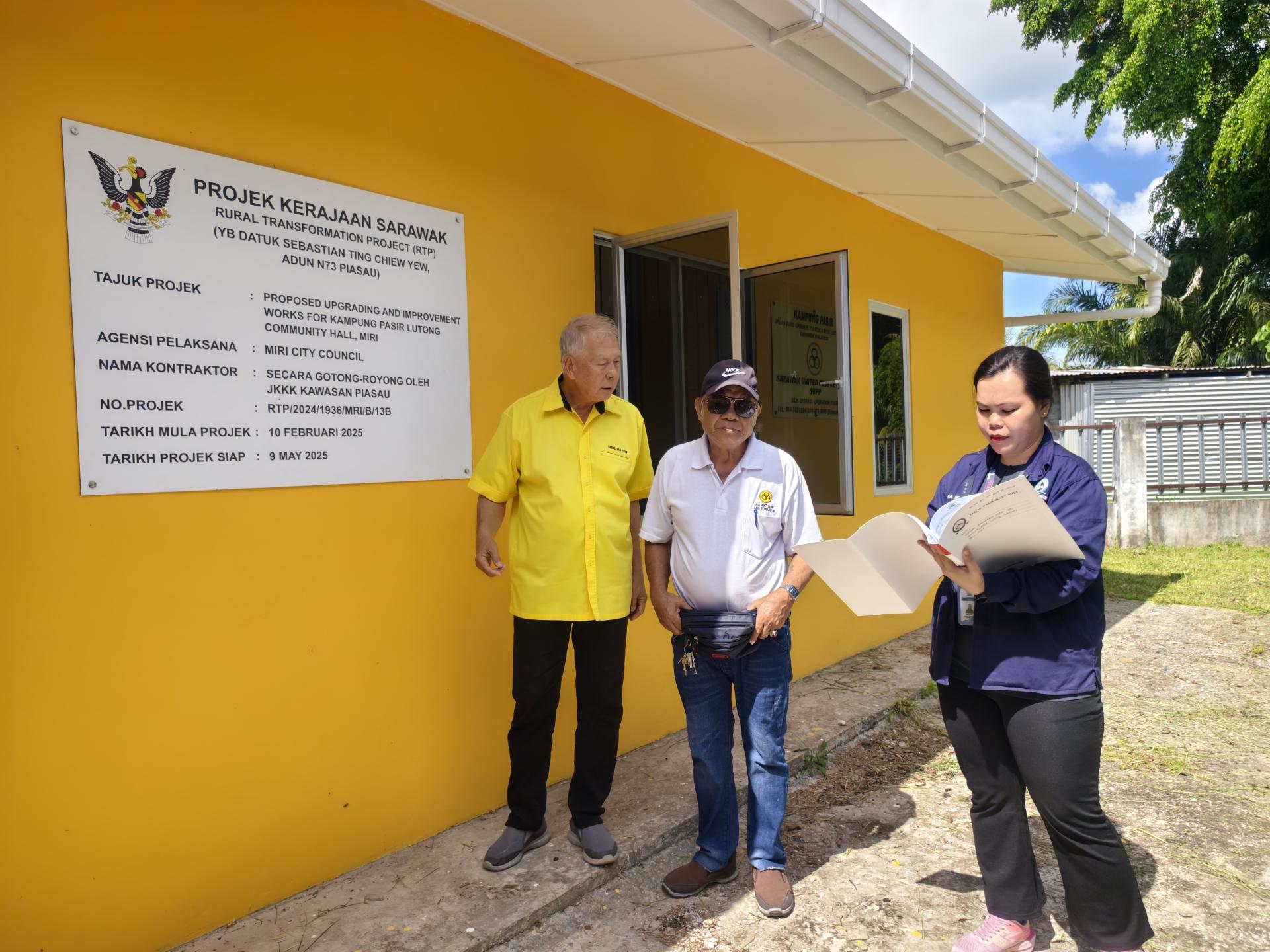砂旅游部副部长兼史纳汀区州议员拿督陈超耀(左)巡视罗东甘榜巴西礼堂在RTP拨款下完成的翻新工程。 他透露,该地属于甘榜地(Kampung land),要进行任何建设都需申请特别准证。经过努力,相关部门已批准建设申请,并同意安装电力供应。