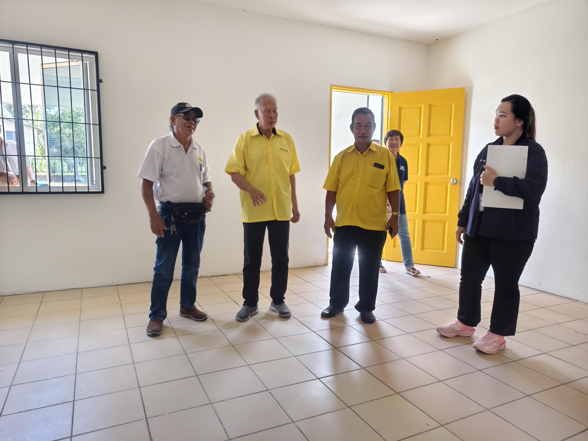 罗东甘榜巴西礼堂设施翻新竣工,拿督陈超耀(左2)与服务团队前往视察工程进展。 他回顾,该地区多年来的建设成果,包括早期投入15万令吉兴建凉亭、约8万令吉建设围墙等工程,整体投入相当可观。