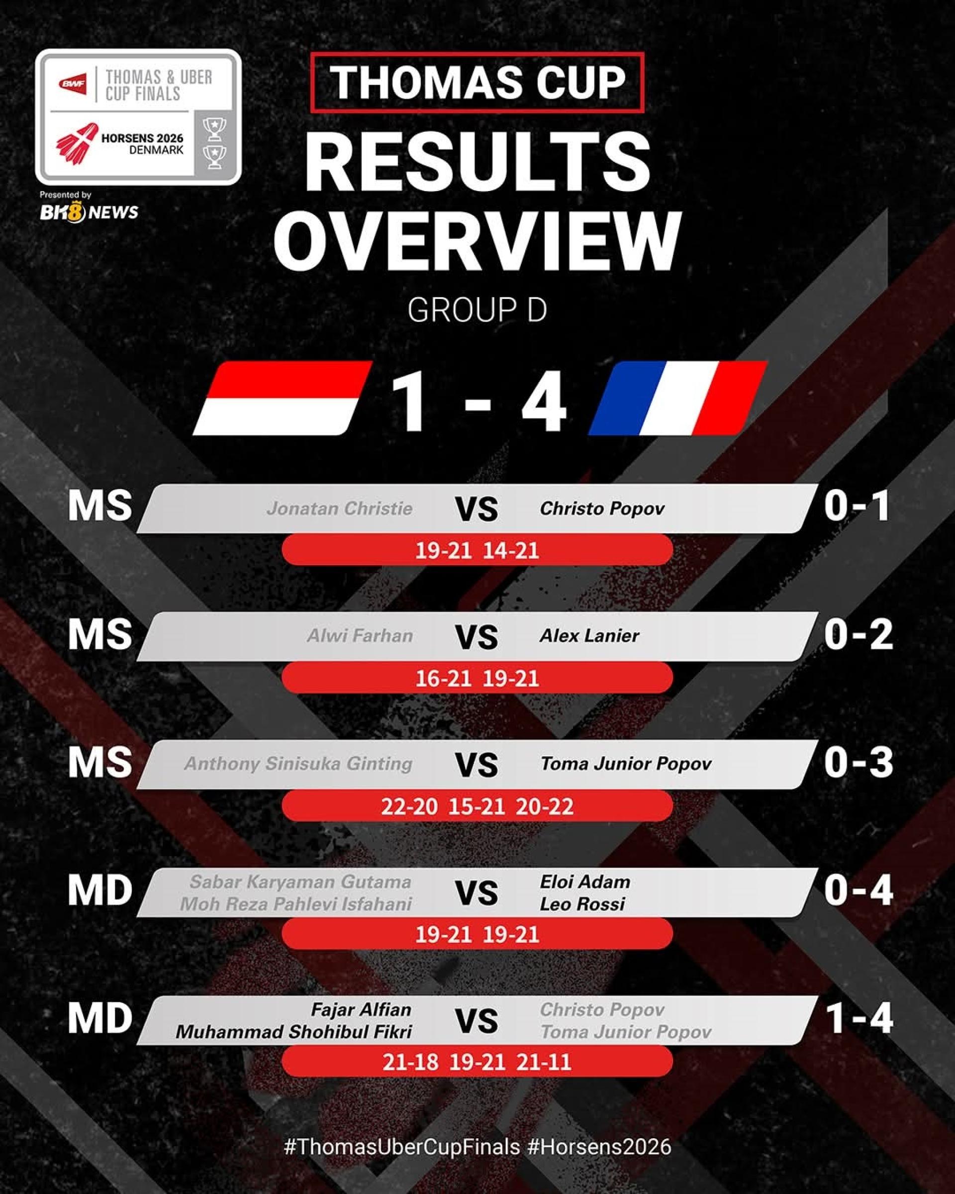 法国3位男单建功,在汤杯D组第三轮小组赛以4比1战胜14届冠军印尼,以副盟主身份与泰国杀进8强淘汰赛。