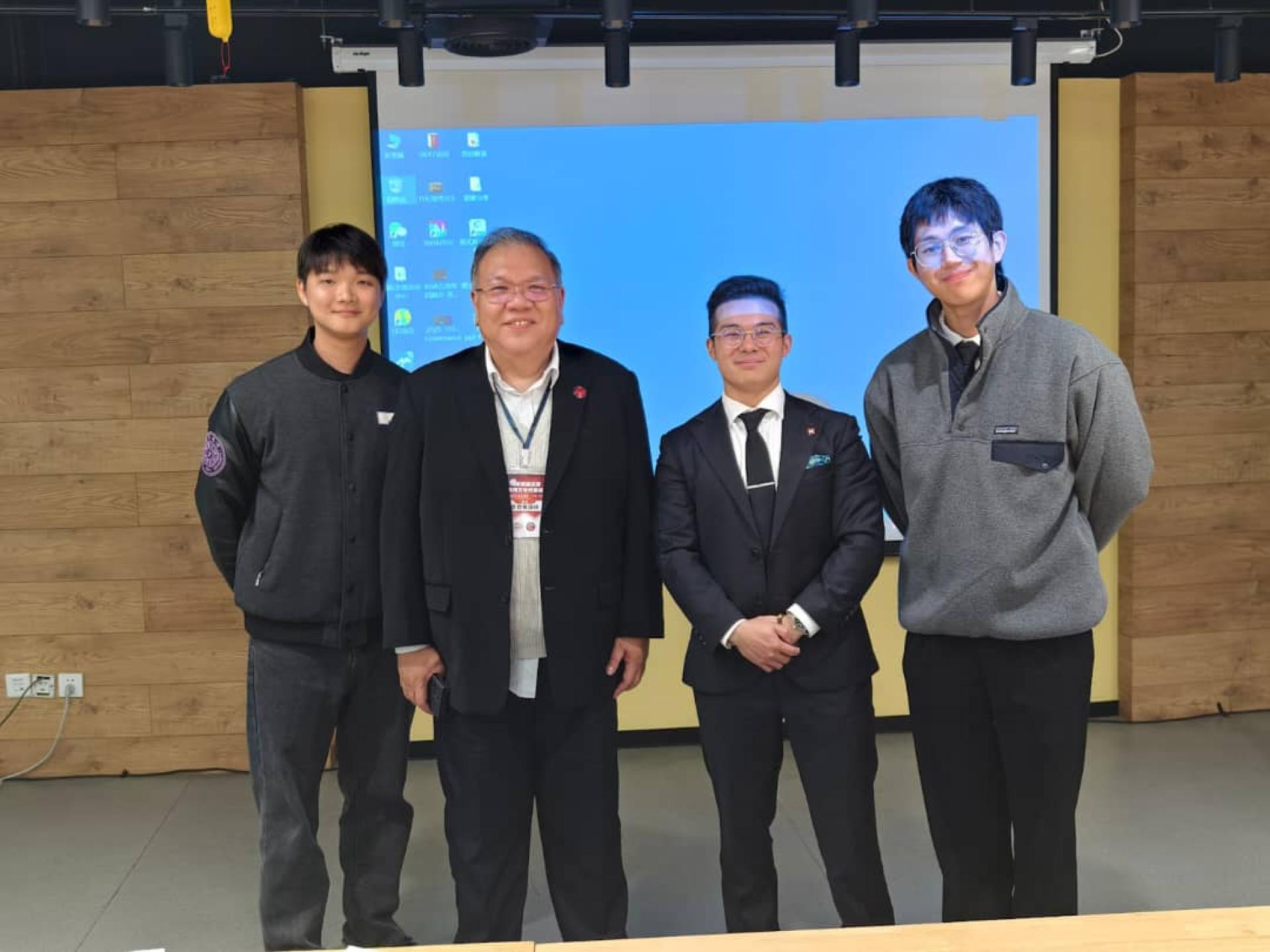 图二:拿督黄国辉(左2)特别会见了三位由他亲自推荐入学、来自古晋与美里的东马学子。 此外,清华大学马来西亚学生代表也踊跃参与交流,包括黄璟琦、黎颖康、郑学谦、吴文杰、廖城媛等人,以及马来西亚学生联谊会会长李子晴及清华大学学生国际文化交流协会会长张靖敏等。双方在座谈中进行了热烈讨论,并达成多项共识,承诺持续深化合作,共同推动马中青年交流事业的发展。