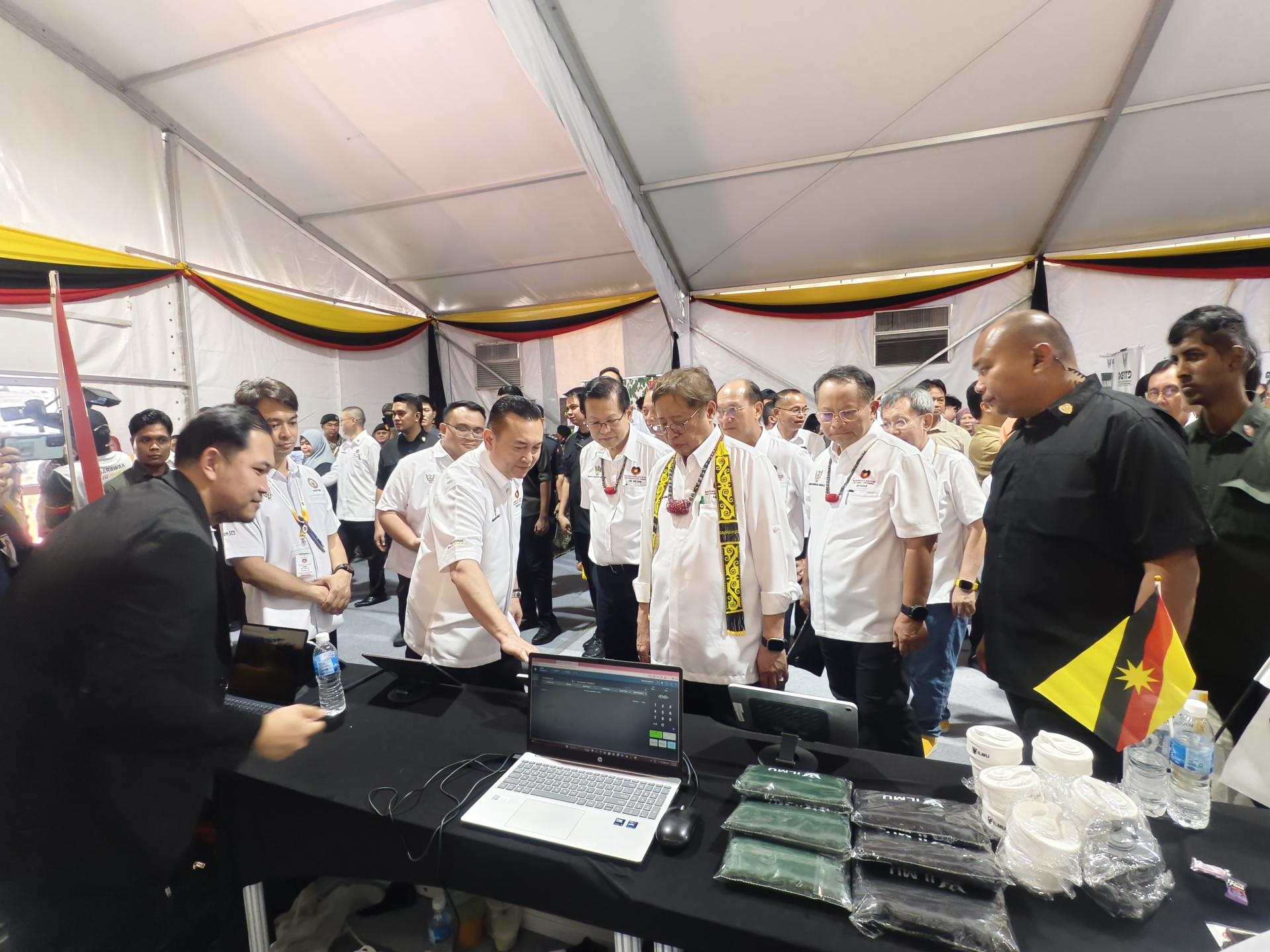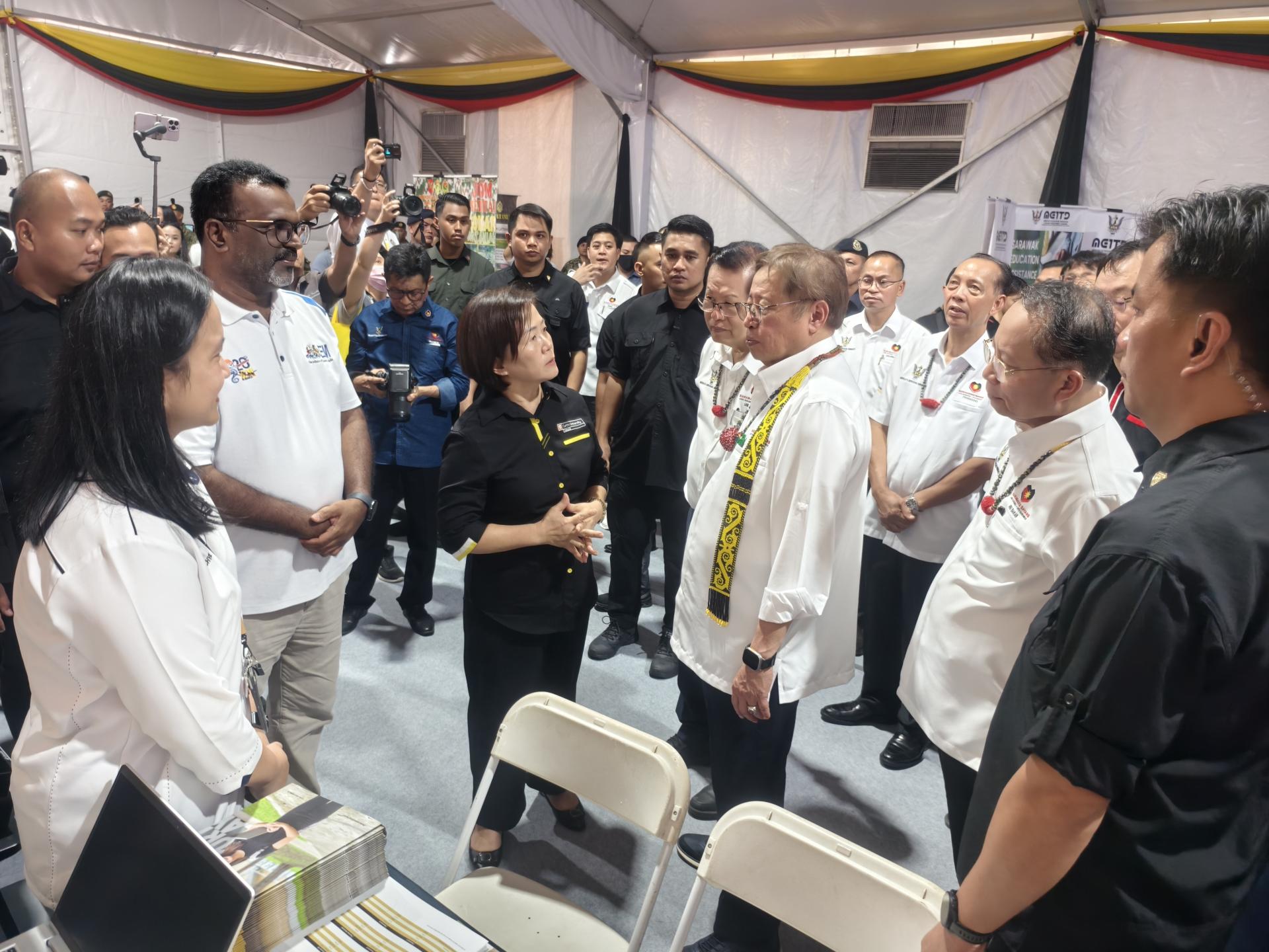 阿邦佐哈巡视“我亲爱的砂拉越”活动美里站展区及服务柜台,了解各单位运作情况,并与参展单位交流。