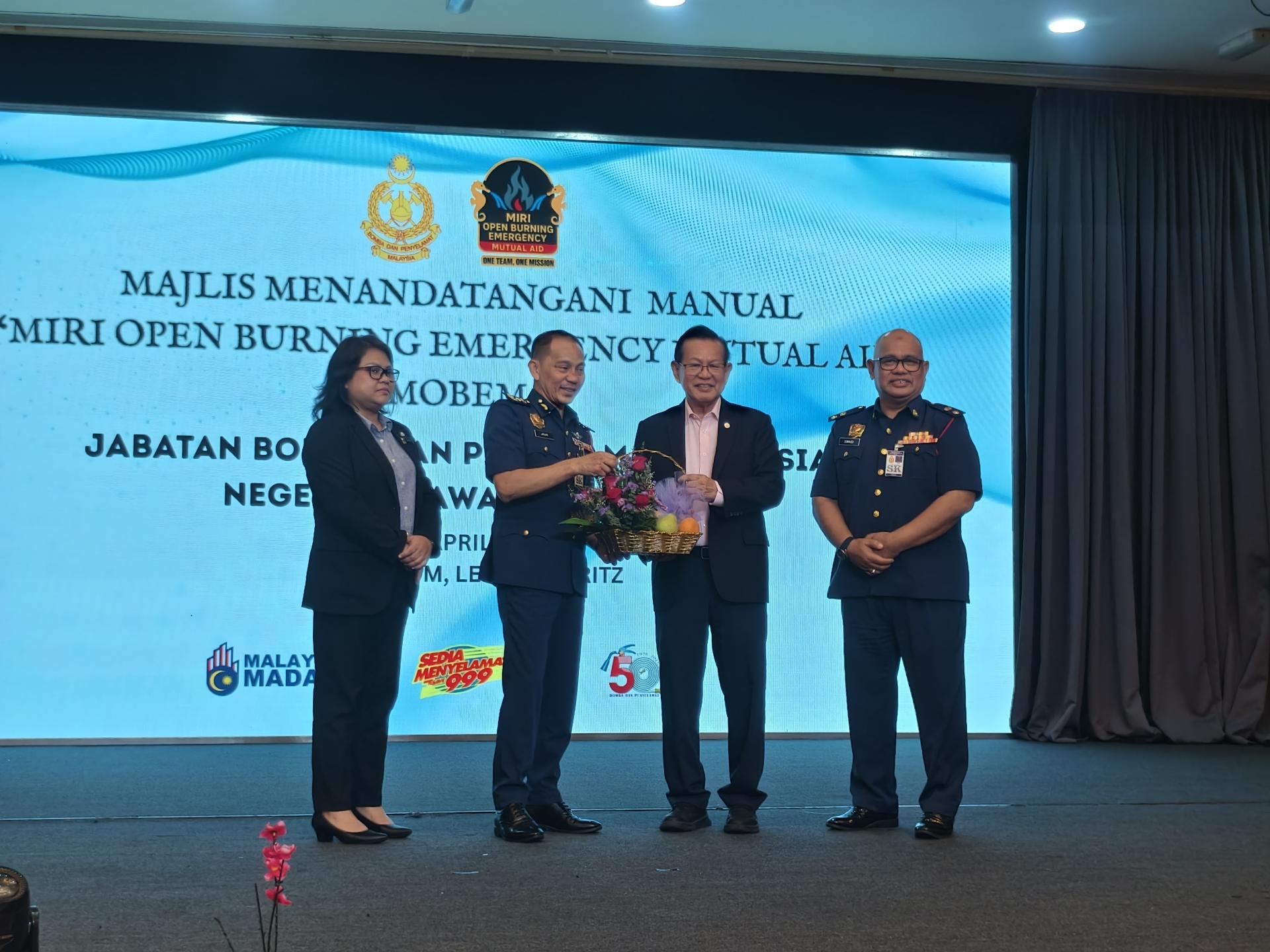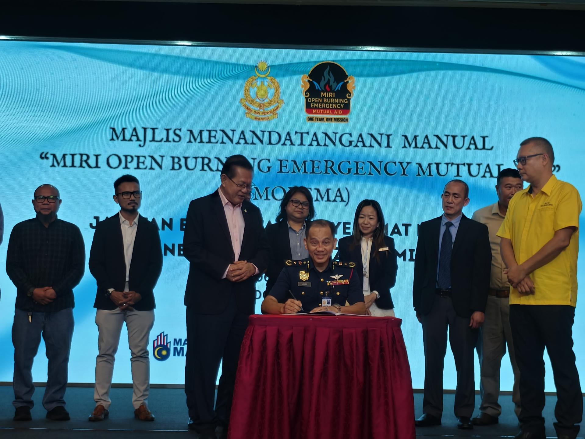 (本报美里6日讯)砂拉越消防与拯救局第6区今日下午在美里美乐大酒店7楼举行美里露天焚烧应急互助手册(Miri Open Burning Emergency Mutual Aid,MOBEMA)谅解备忘录签署仪式。