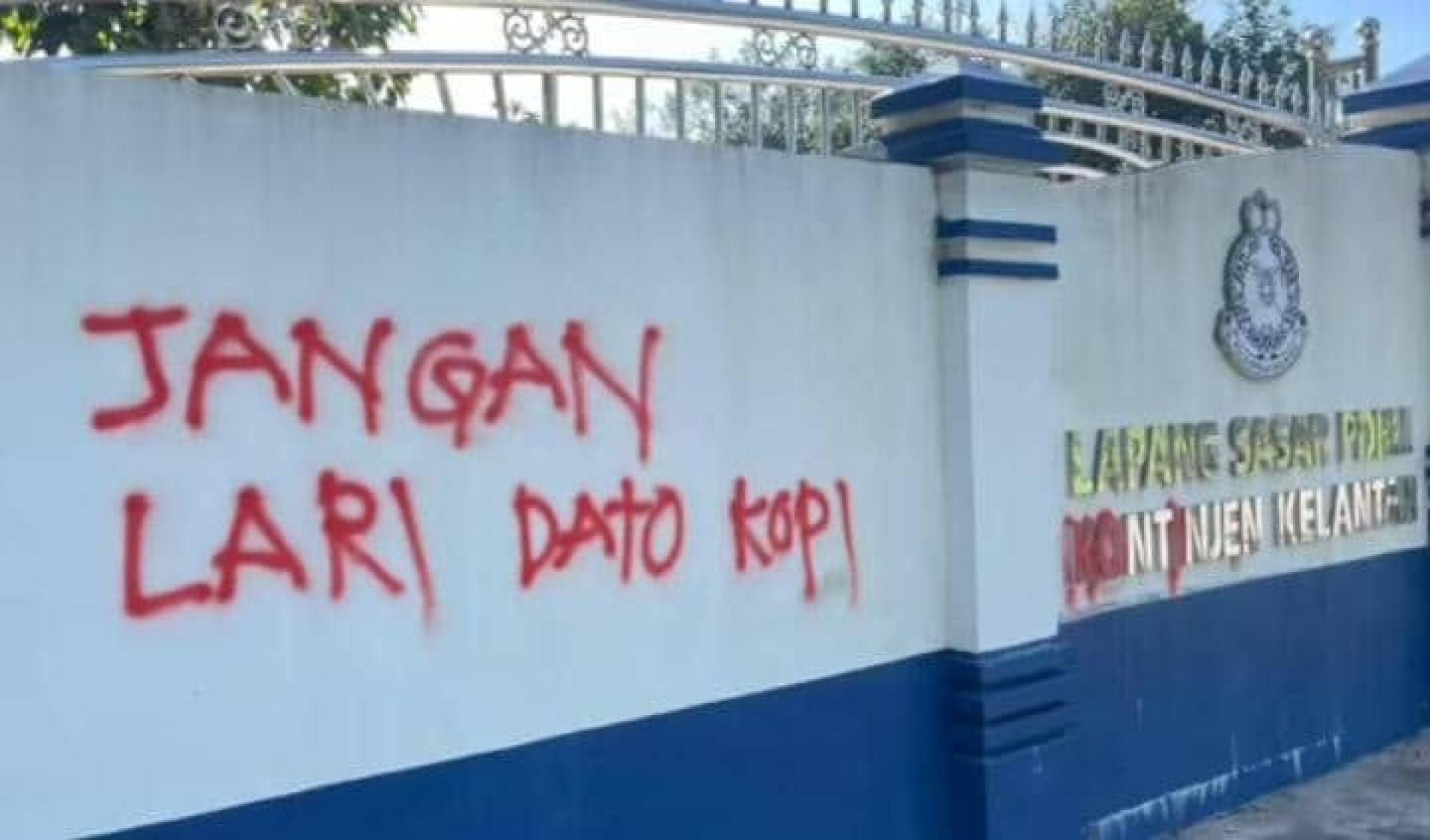早前社交媒体上流传数张照片,照片显示地点为丹州警察总部射击场的外墙,墙上被人使用红漆涂写“Jangan Lari Dato Kopi”等字眼。