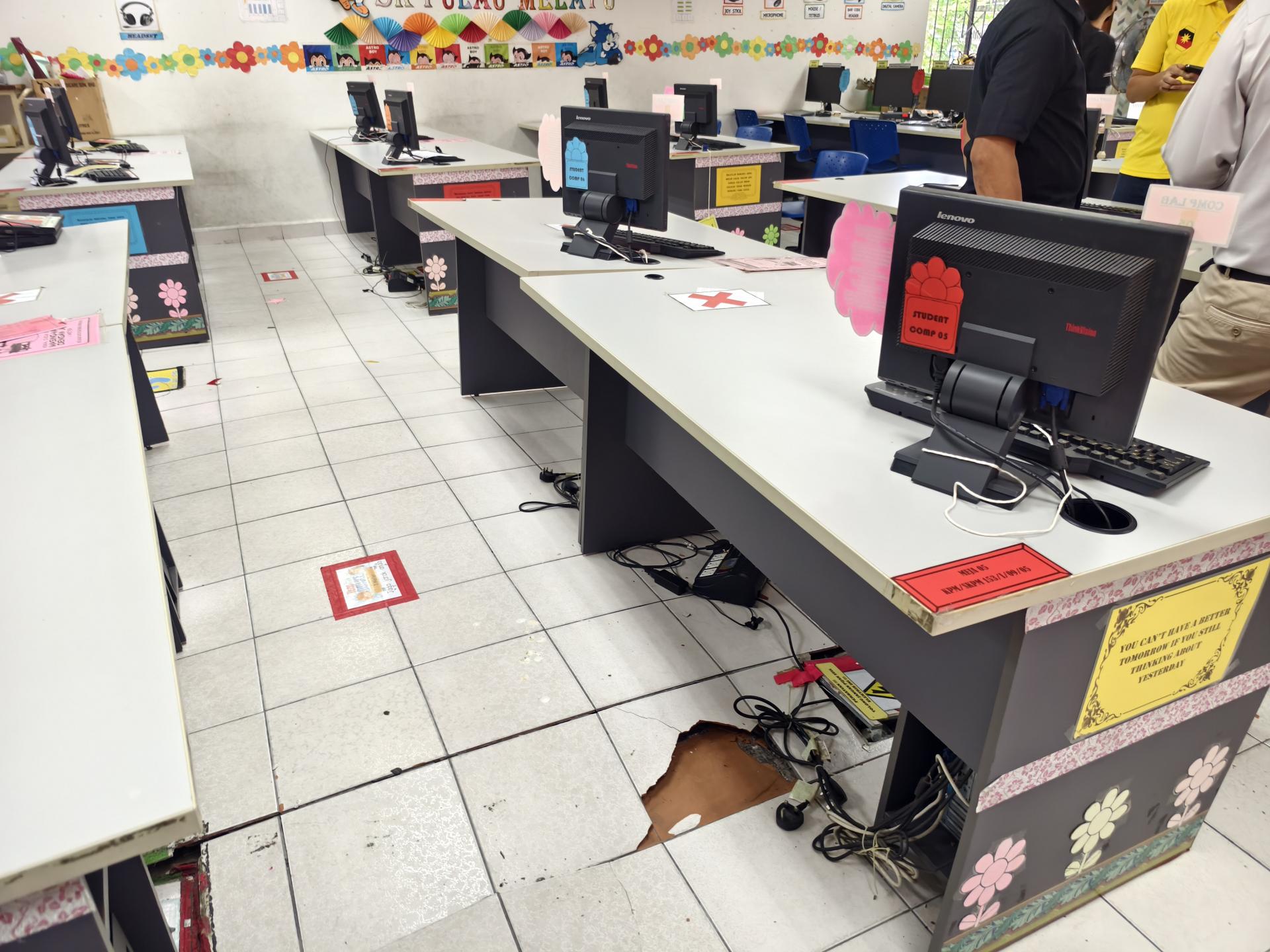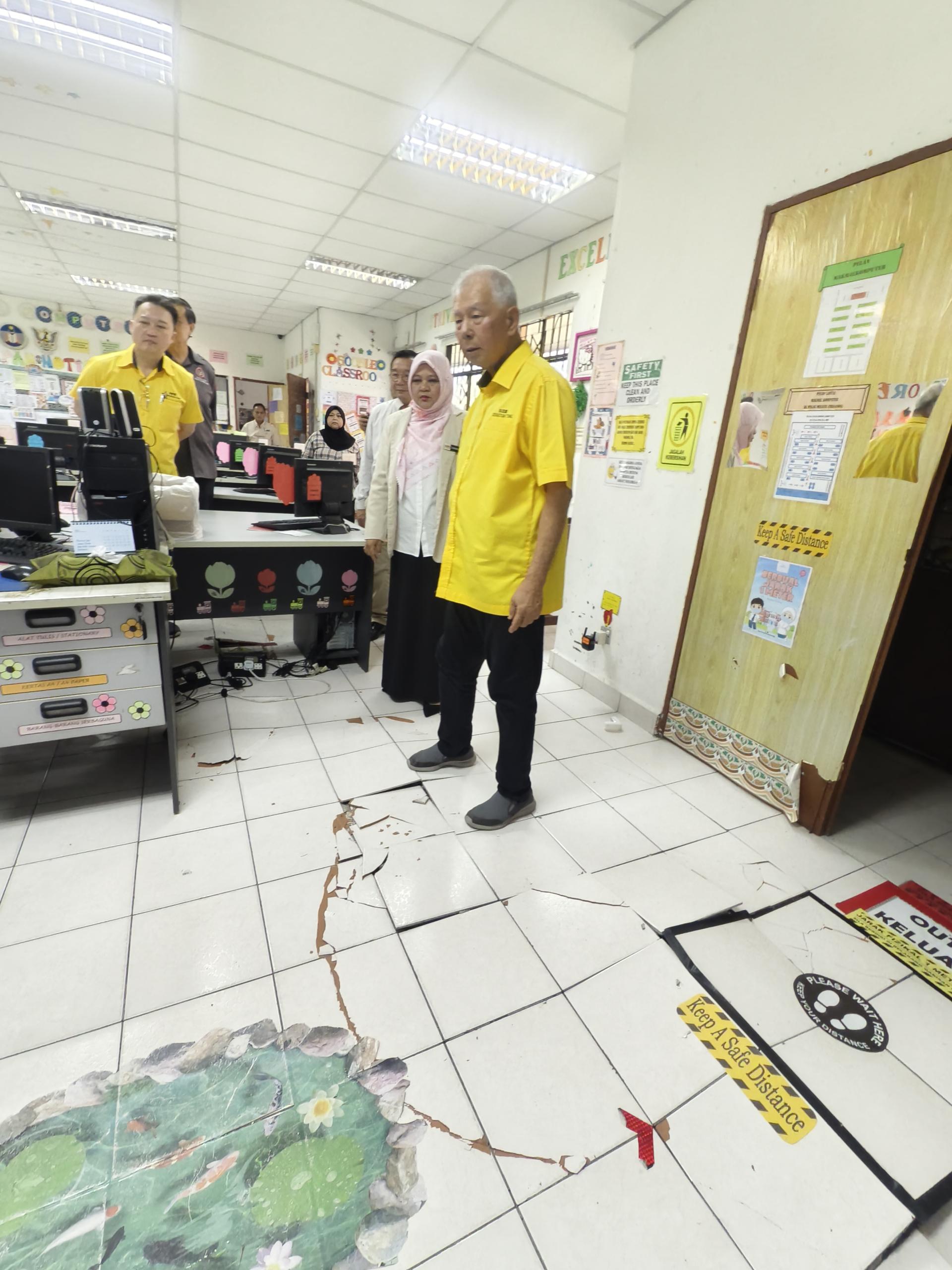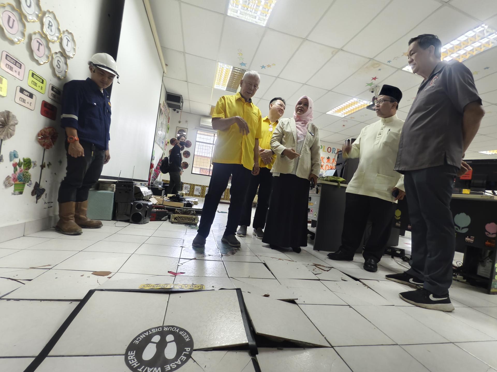 (本报美里16日讯)布劳马来尤国小(SK Pulau Melayu)电脑室地板地砖严重龟裂,影响学生使用,校方在等待拨款落实修复之际,迎来好消息。砂旅游部副部长兼卑尔骚区州议员拿督陈超耀今早到校巡视,并确认该工程将通过2024年乡区转型计划(RTP)拨款10万令吉展开。