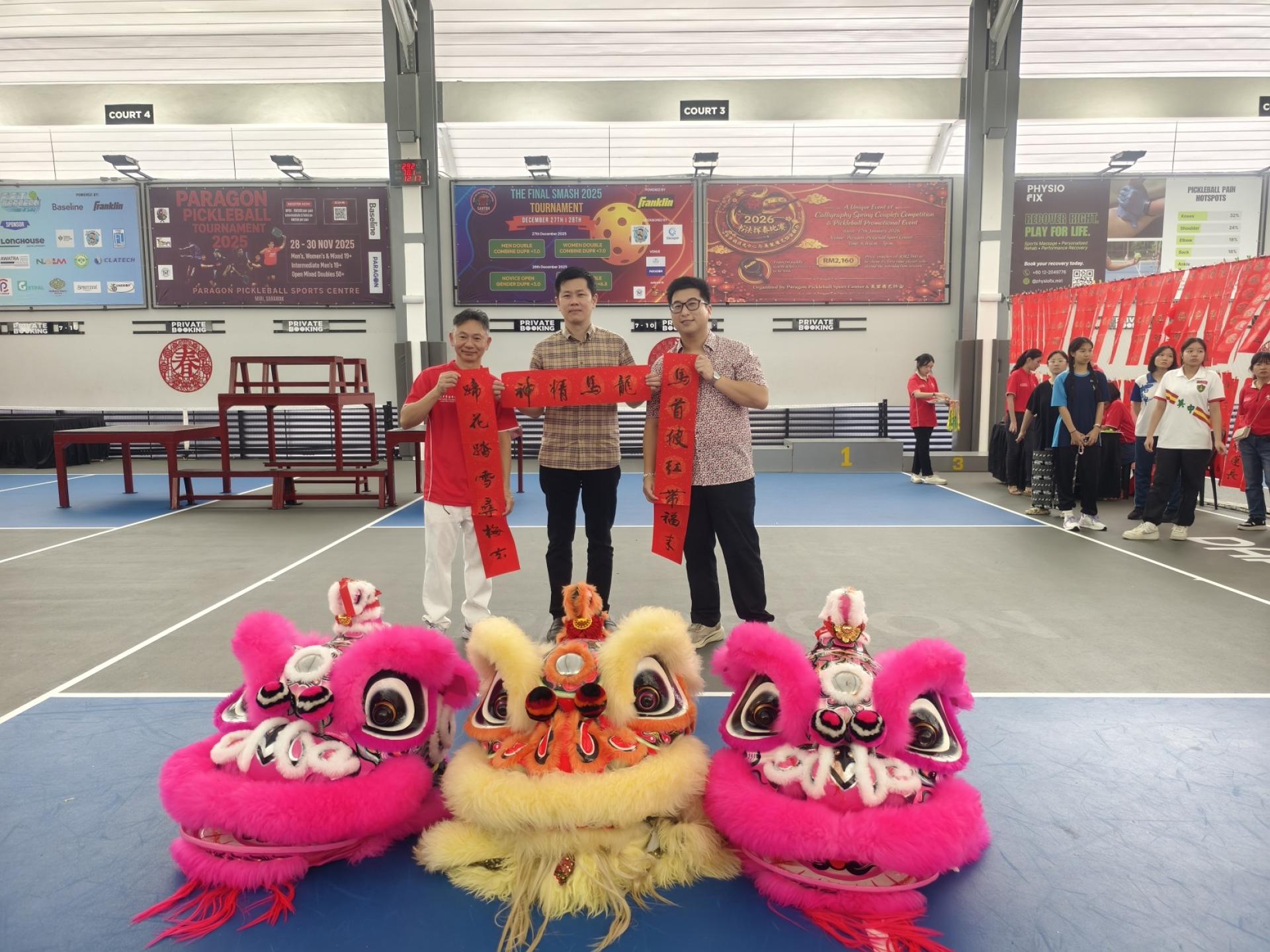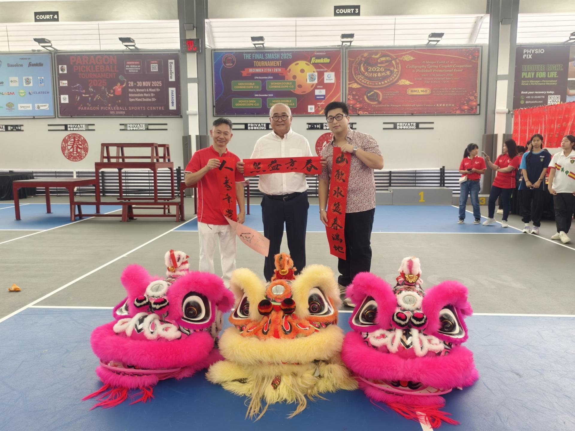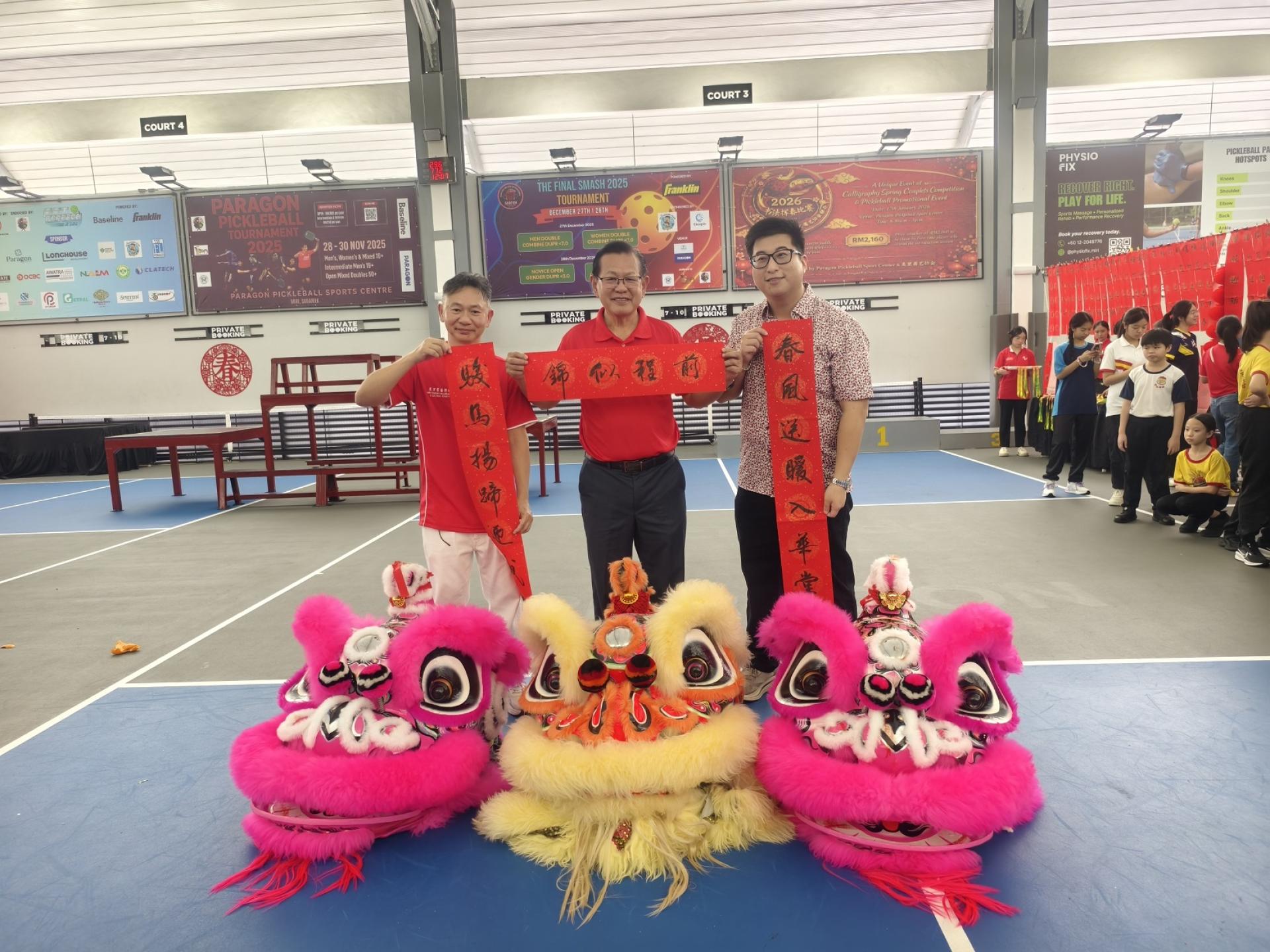 活动由多名嘉宾共同见证,包括百乐城匹克球中心主席林忠亮及夫人江明芬、执行董事林大富、美里书艺学会秘书李家武、美里市长俞小珊、美里省华总会长许信隆,以及开幕主宾砂拉越交通部长拿督斯里李景胜。活动上,主办单位也向嘉宾赠送挥春对联,象征丙午年新春喜气吉祥。