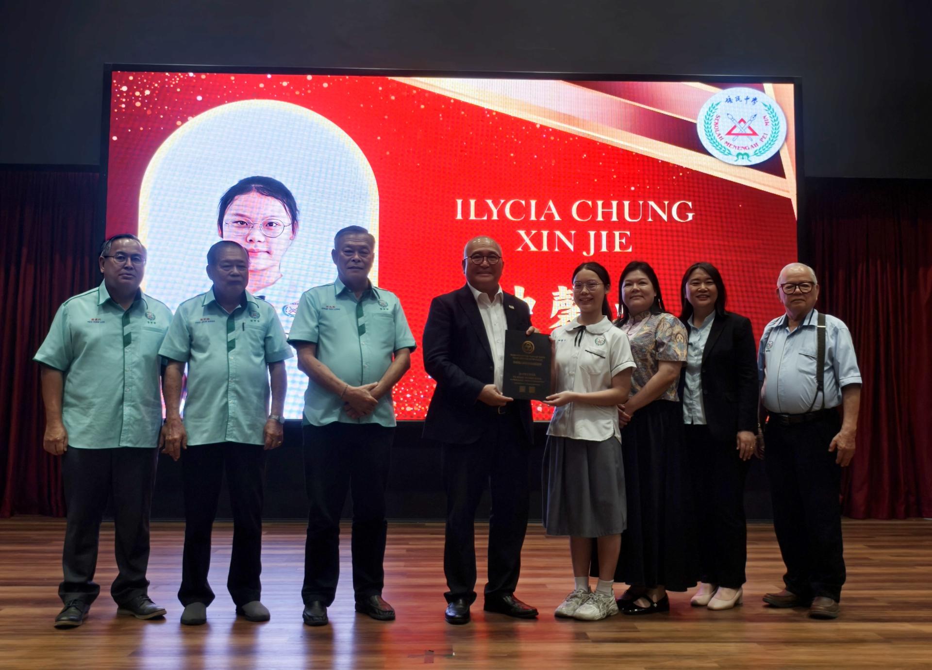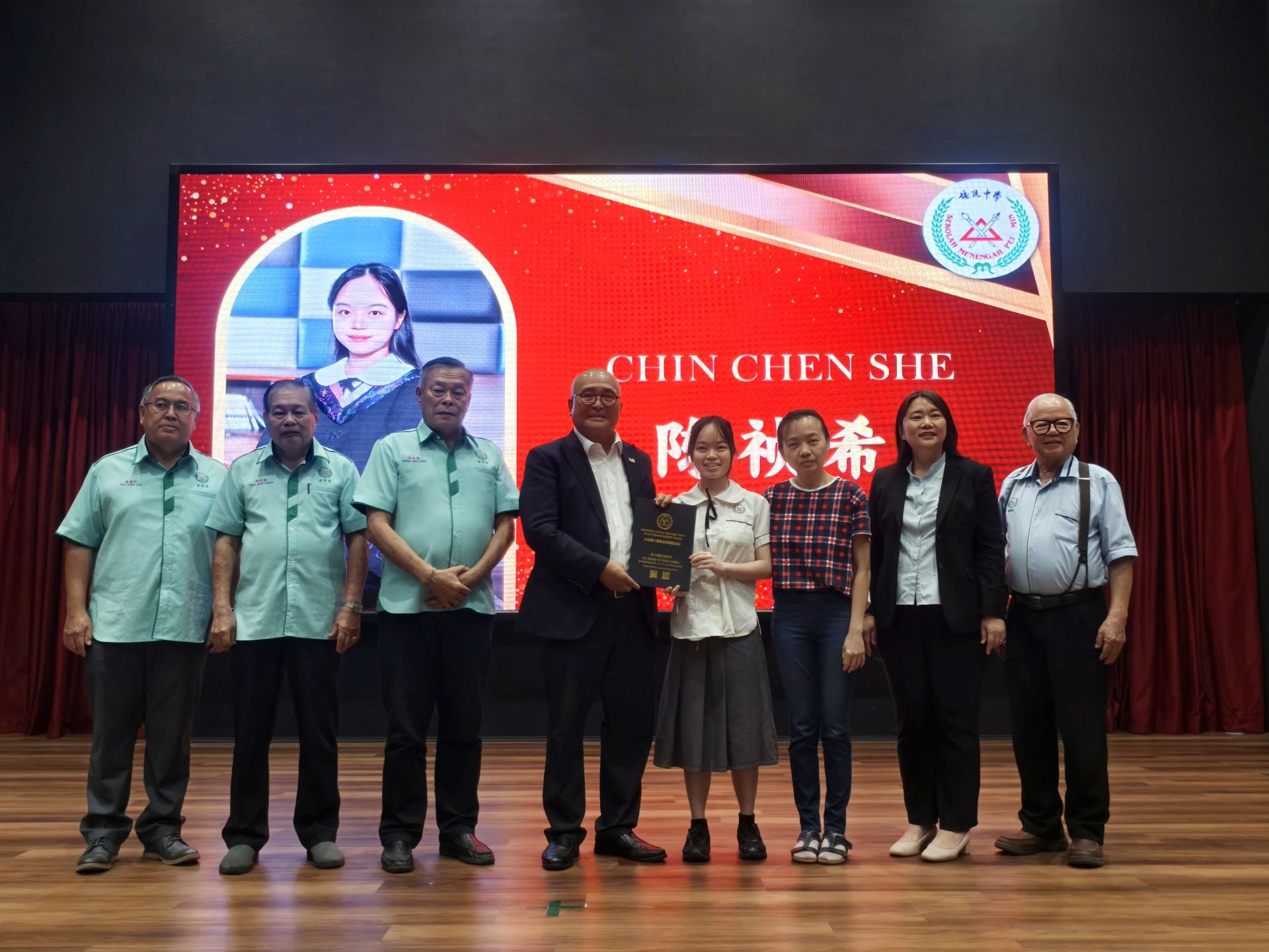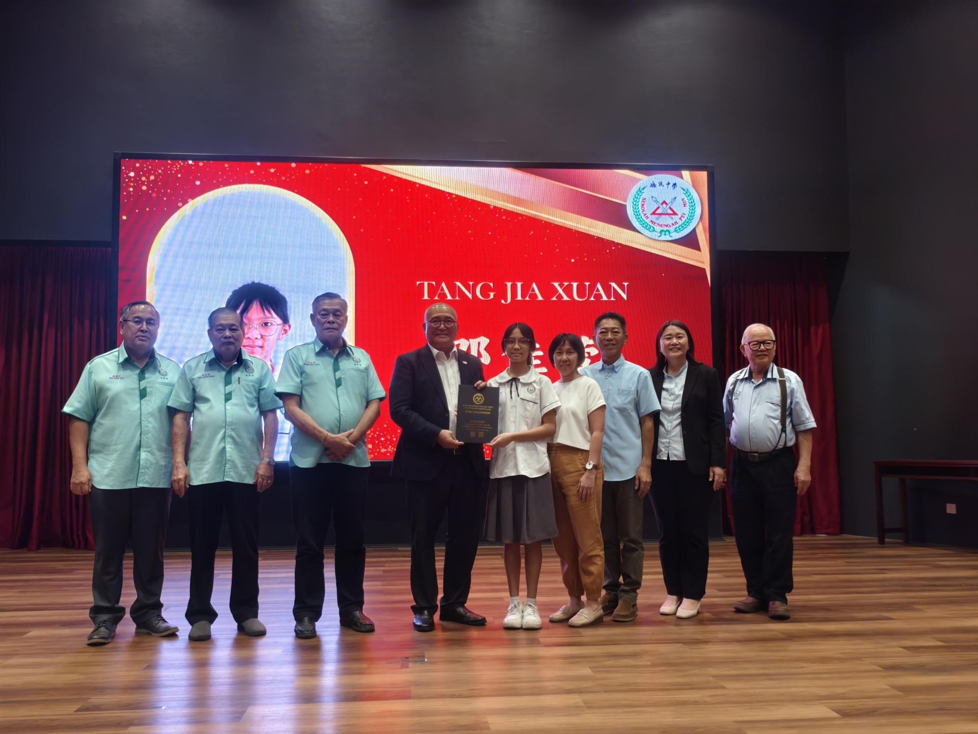 俞小珊(左4)颁奖给卓越学术表现暨初中统考荣获8As优异成绩学生钟馨洁。
