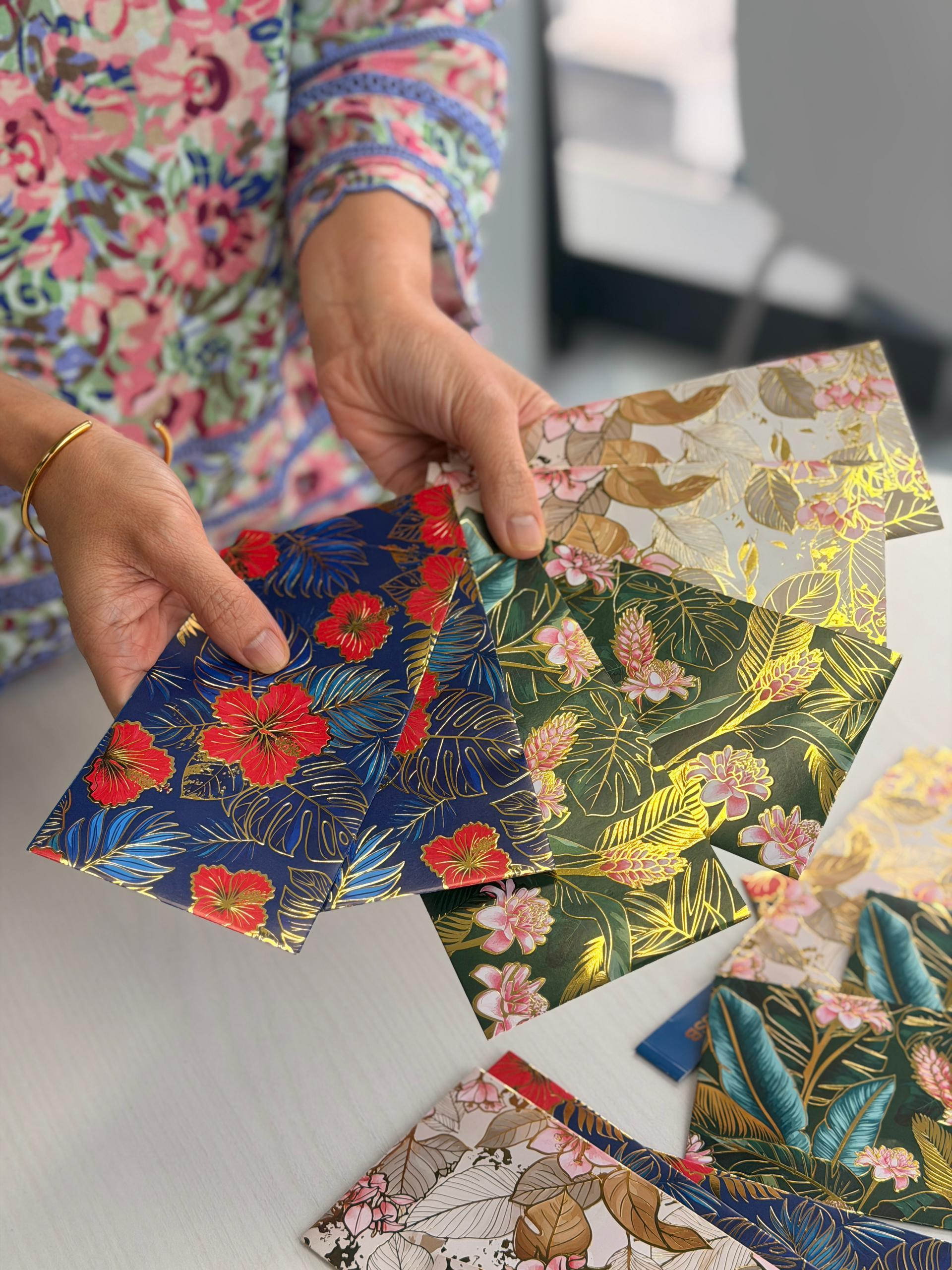 该系列青包由MBSB创意主管Erween Ellianna设计,图案以大红花、三角梅及姜花为主题,三款不同花卉各具特色。当青包并排摆放时,图案可自然衔接,形成一幅连贯的花园图景,寓意多元文化与自然和谐共融。
