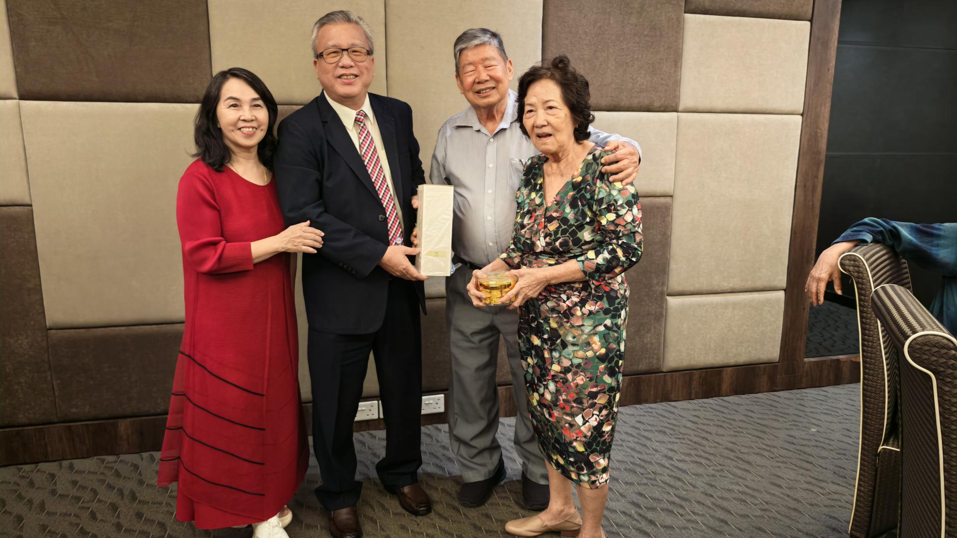 拿督威拉蔡德兴伉俪(左1与2)赠送纪念品予蔡增城伉俪时摄。