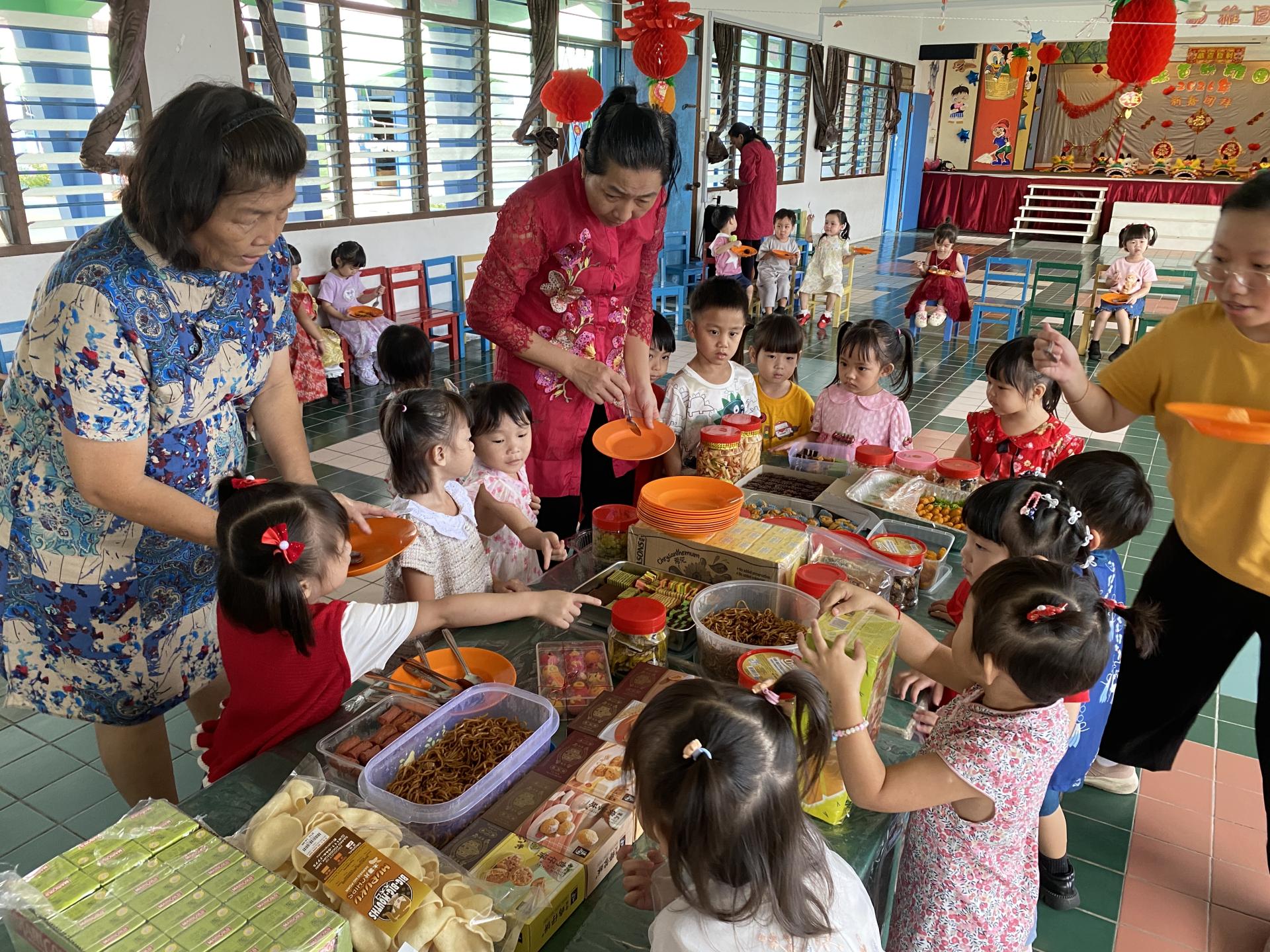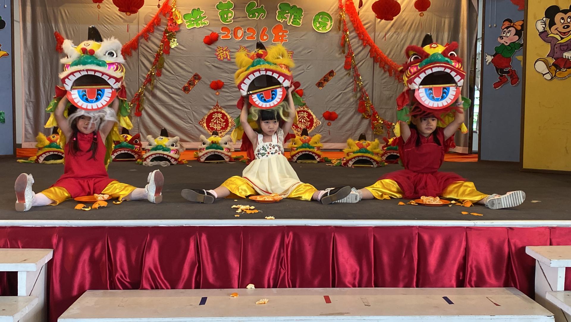 小朋友们开心地齐唱新年歌,并欣赏舞狮表演,感受浓厚的节日气息。同学们还带来了各式新年食品互相分享,寓意新的一年步步高升。
