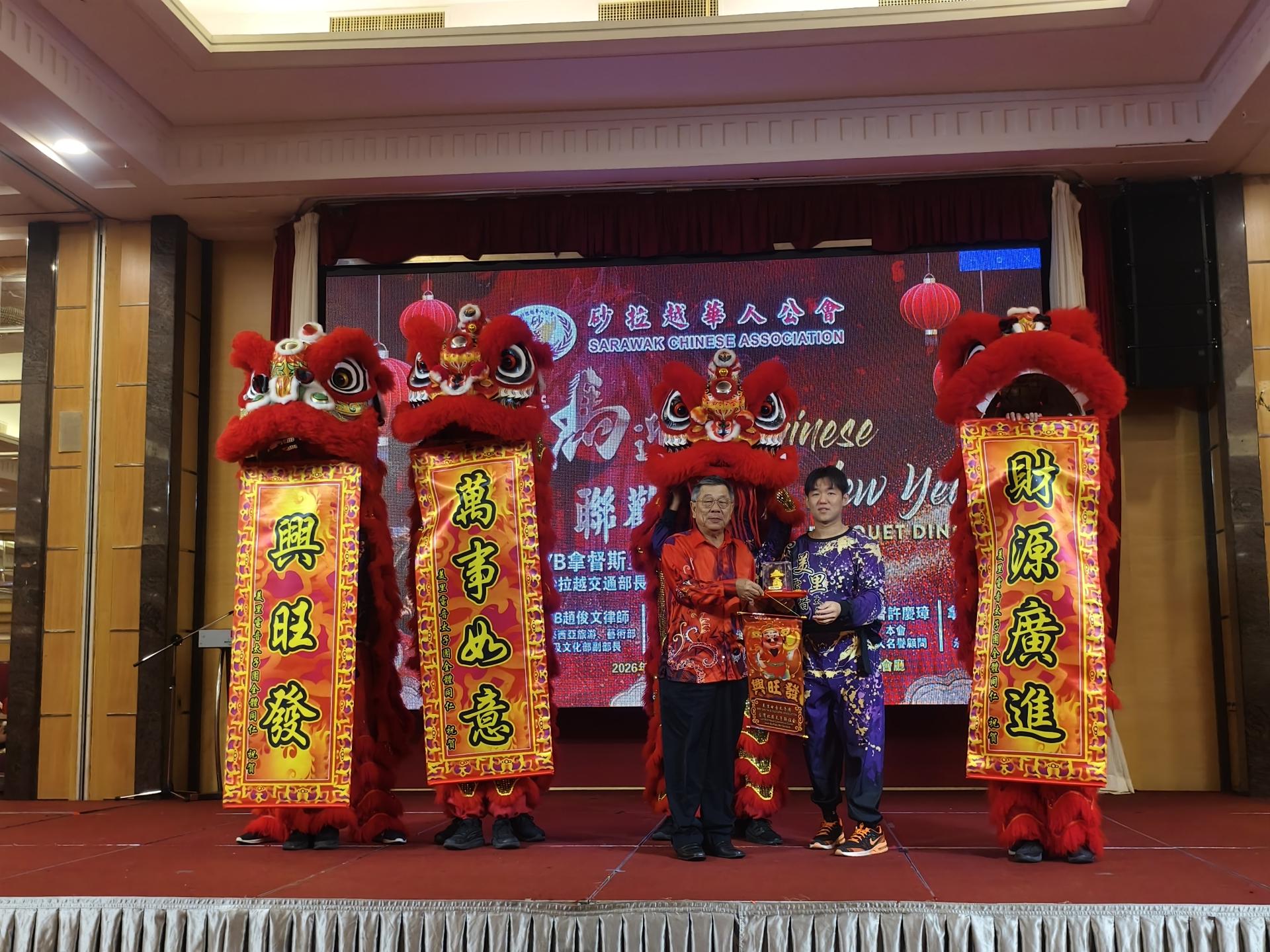 砂拉越华人公会会务顾问陈邦顺代表大会从瑞狮团手中接过贺礼。