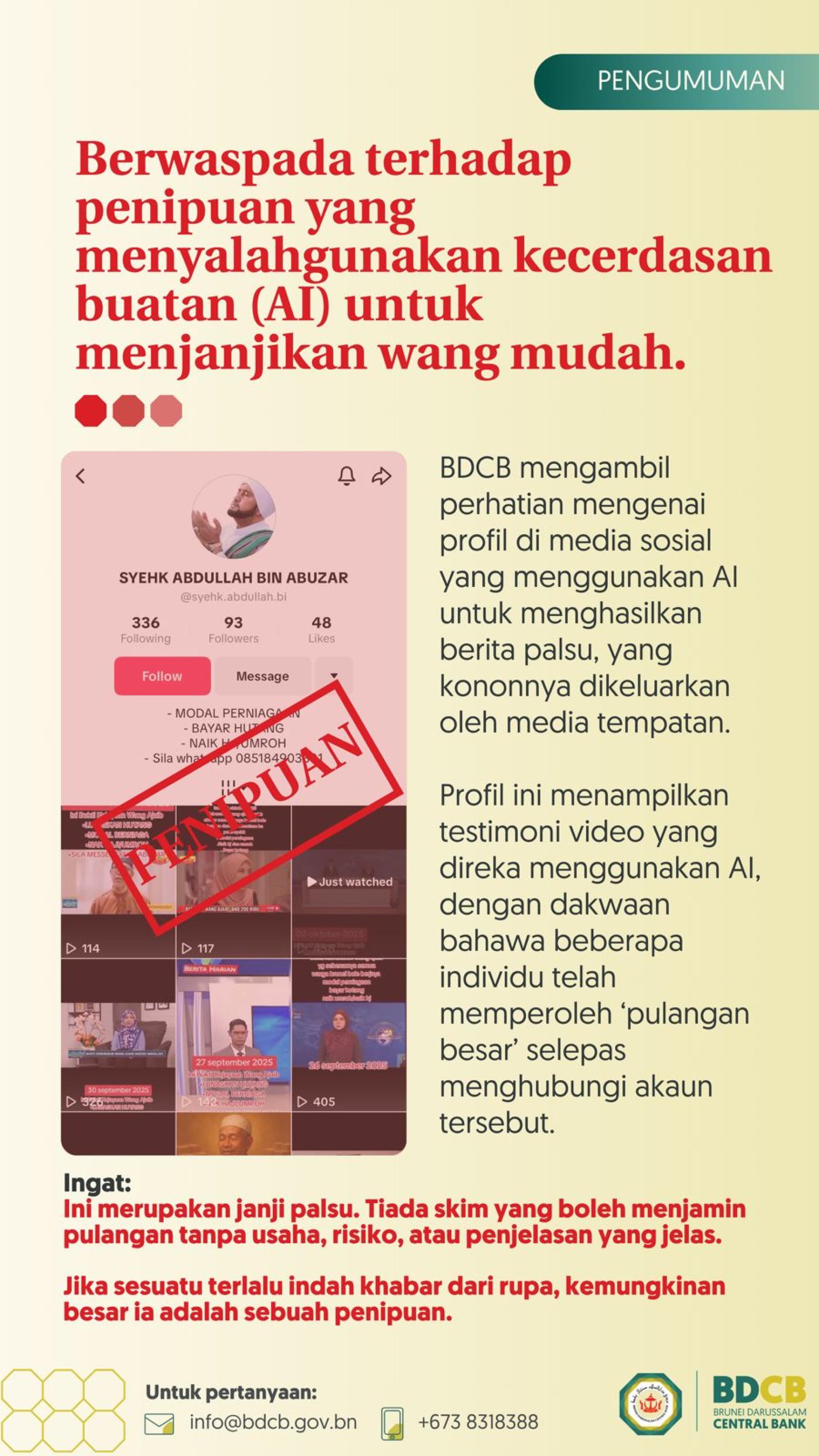 若有疑问或需核实资讯,公众可联络:电邮:info@bdcb.gov.bn或致电:+6738318388。