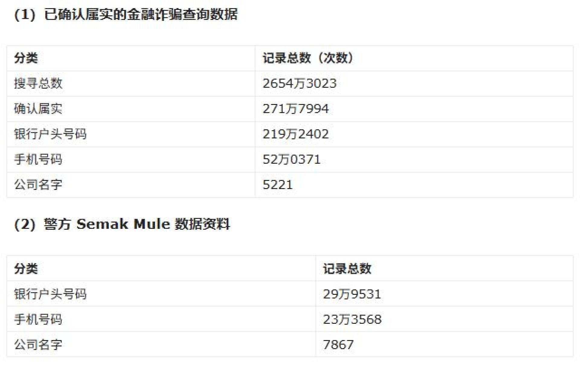 他周四召开记者会说,迄今有271万7994次搜寻次数中,发现有银行户头、手机号码和公司名字被证实是涉及诈骗活动。