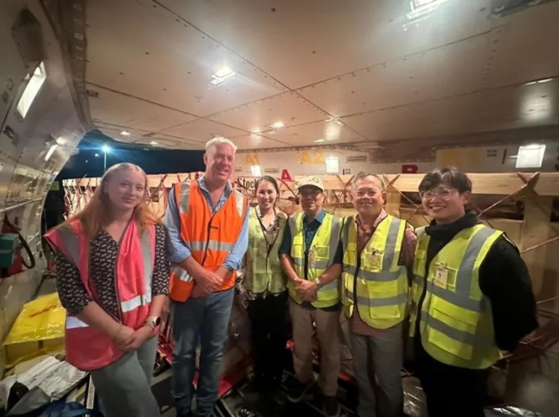 2025年12月16日,拿督马丁本(右2)在货机内,与其右侧的拿督阿德里安苏辛等人迎接自澳洲抵达的青年母牛。