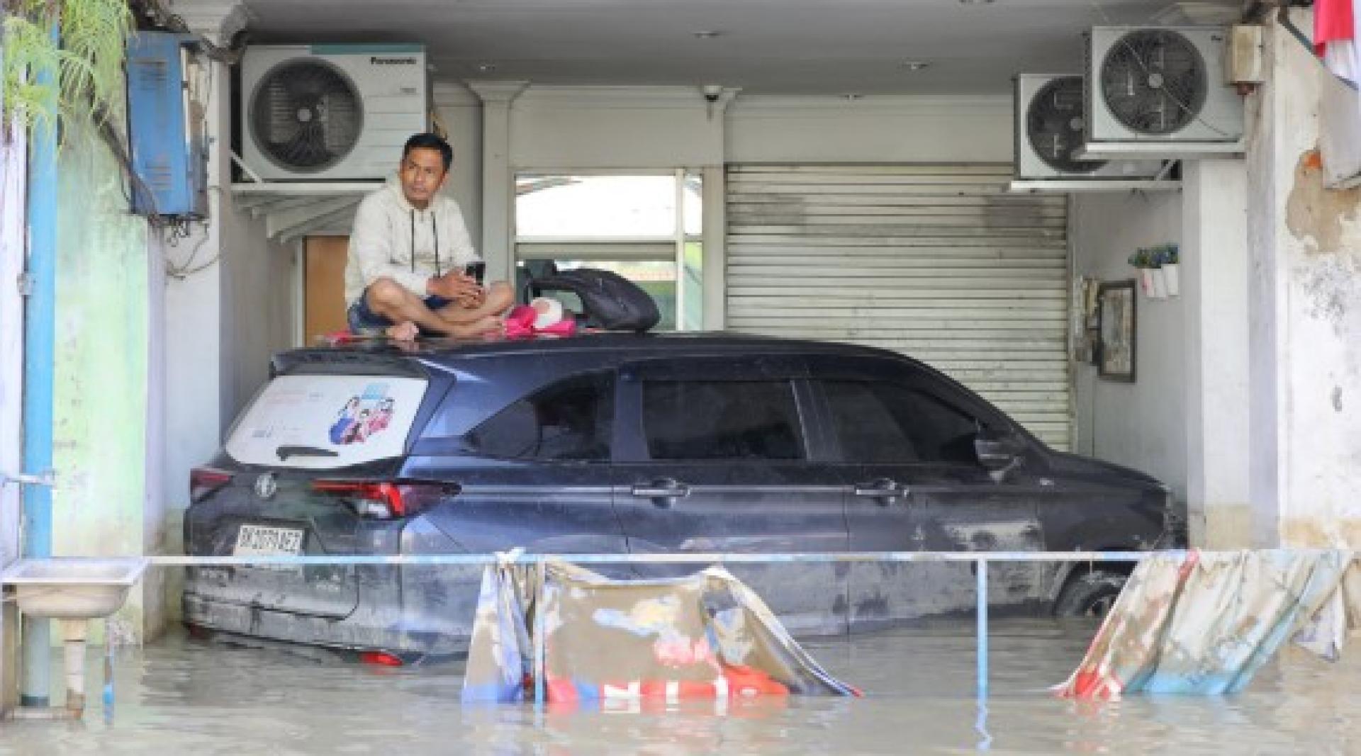 冷吉县丹戎普拉镇遭遇洪灾,男子在家门口的汽车顶上休息。 逃至棉兰后,庄镇墙依旧放心不下老宅和店铺。11月30日,他第一次折返于此。眼前满目疮痍的街区,让老人沉默良久,“这么大的洪水,这辈子第一次见”。