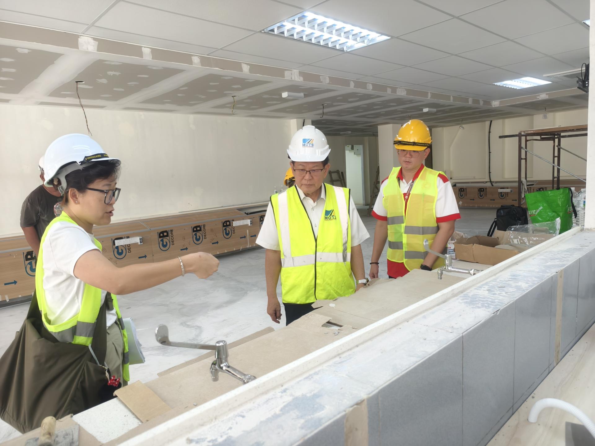 李景胜(中)巡察美里红新月会洗肾中心第一大厅全面翻新工程,了解进度。 他说,透析机连同透析椅及配件,每台需逾5万令吉。中心至今已筹获约140万至150万令吉,仍需社会继续支持。“我们坚持自筹经费,病患仅需支付象征式费用,并为低收入群体(B40)提供补助。”