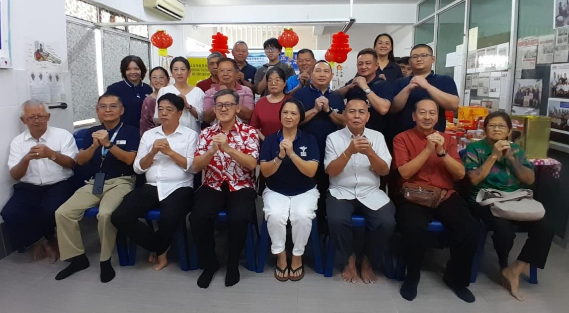 正康爱心中医团队举办会员丙午年春节团拜。前排左起为田明东、刘祐宏、许义华、主宾薛华东、该团队负责人钟其每、甲必丹林传政、孙守生等人。