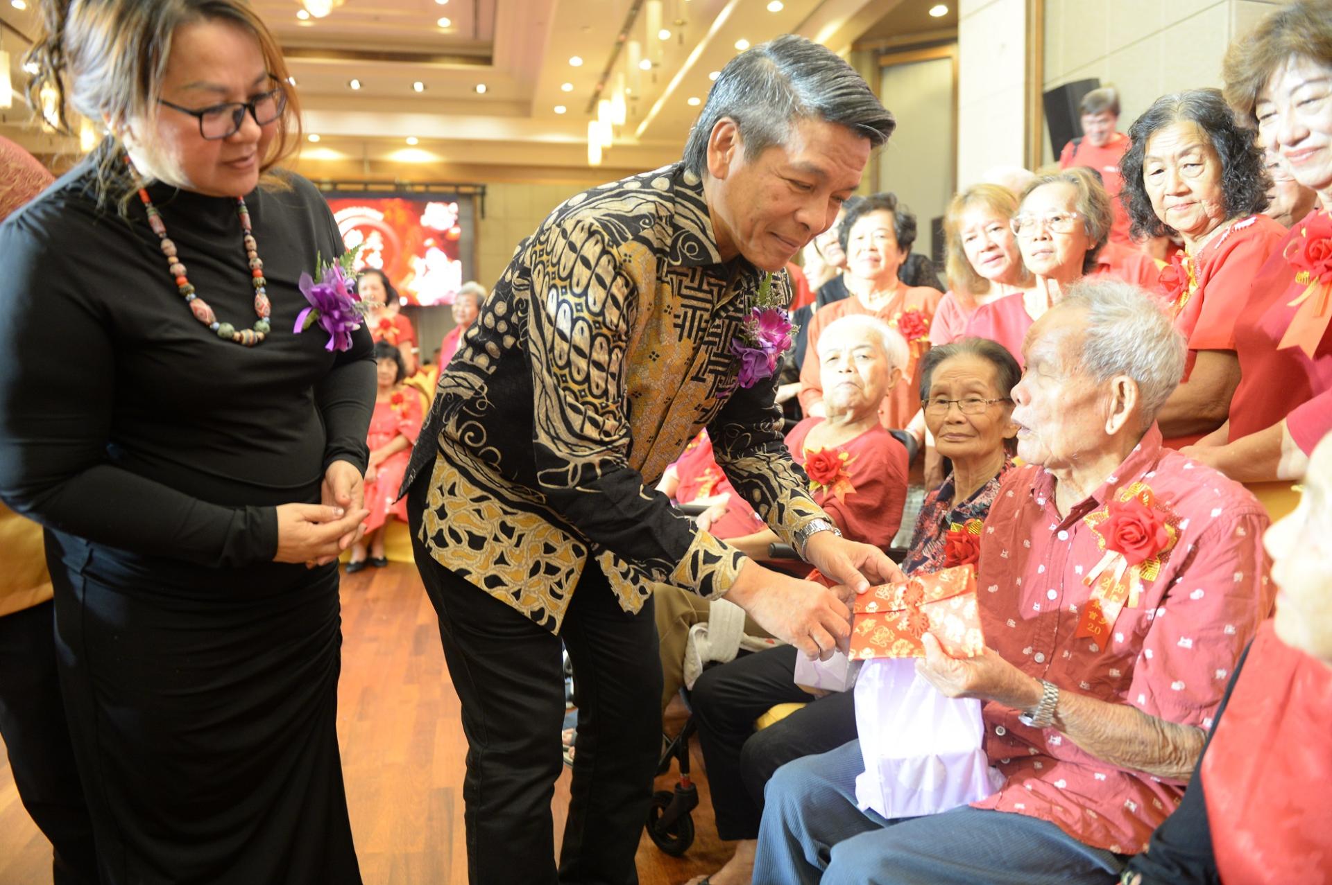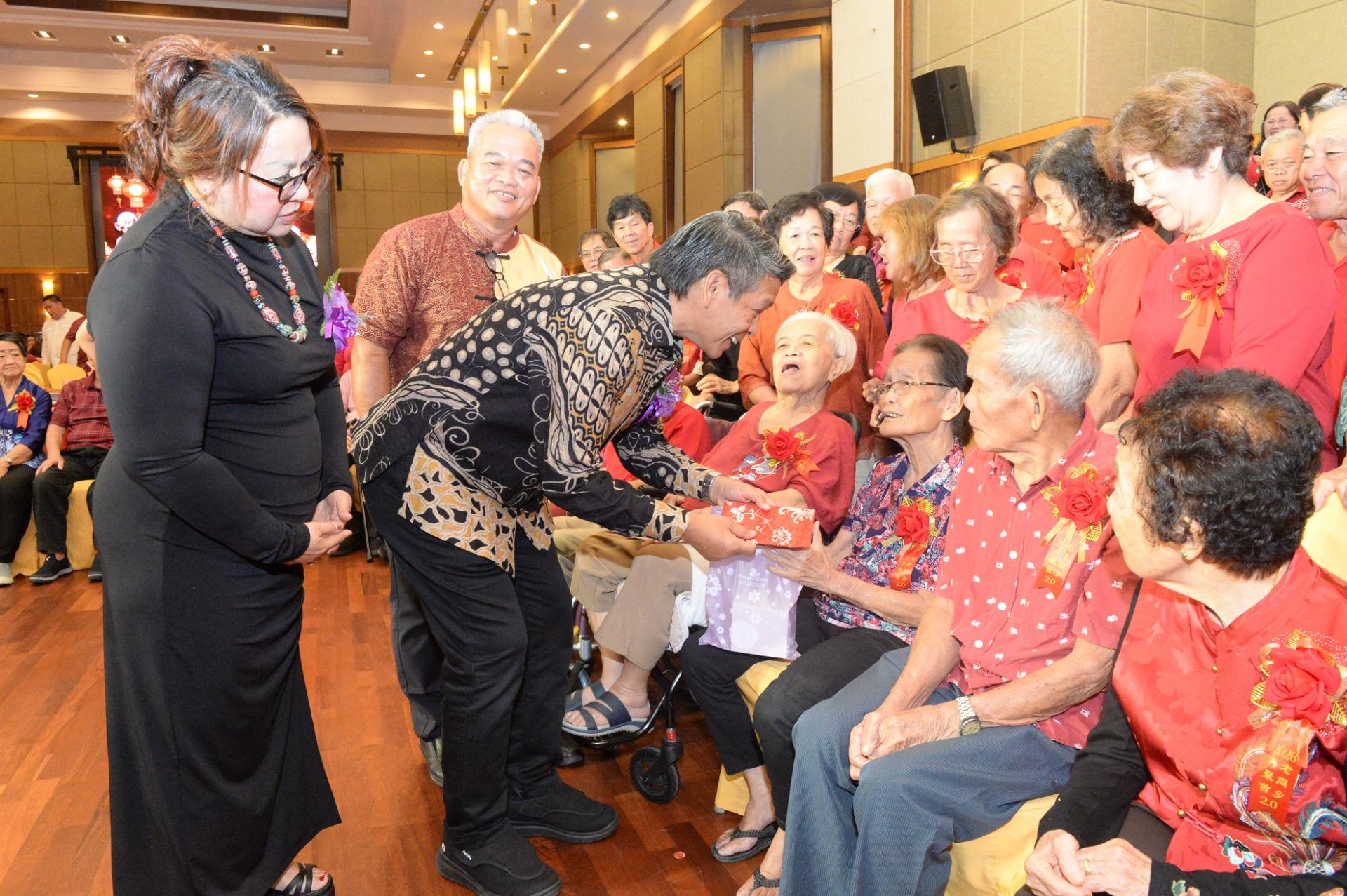 拿督丹尼斯奥(左2)与其夫人,在叶焕育在陪同下颁发红包予出席晚宴最年长者91岁的沈桂花时摄。