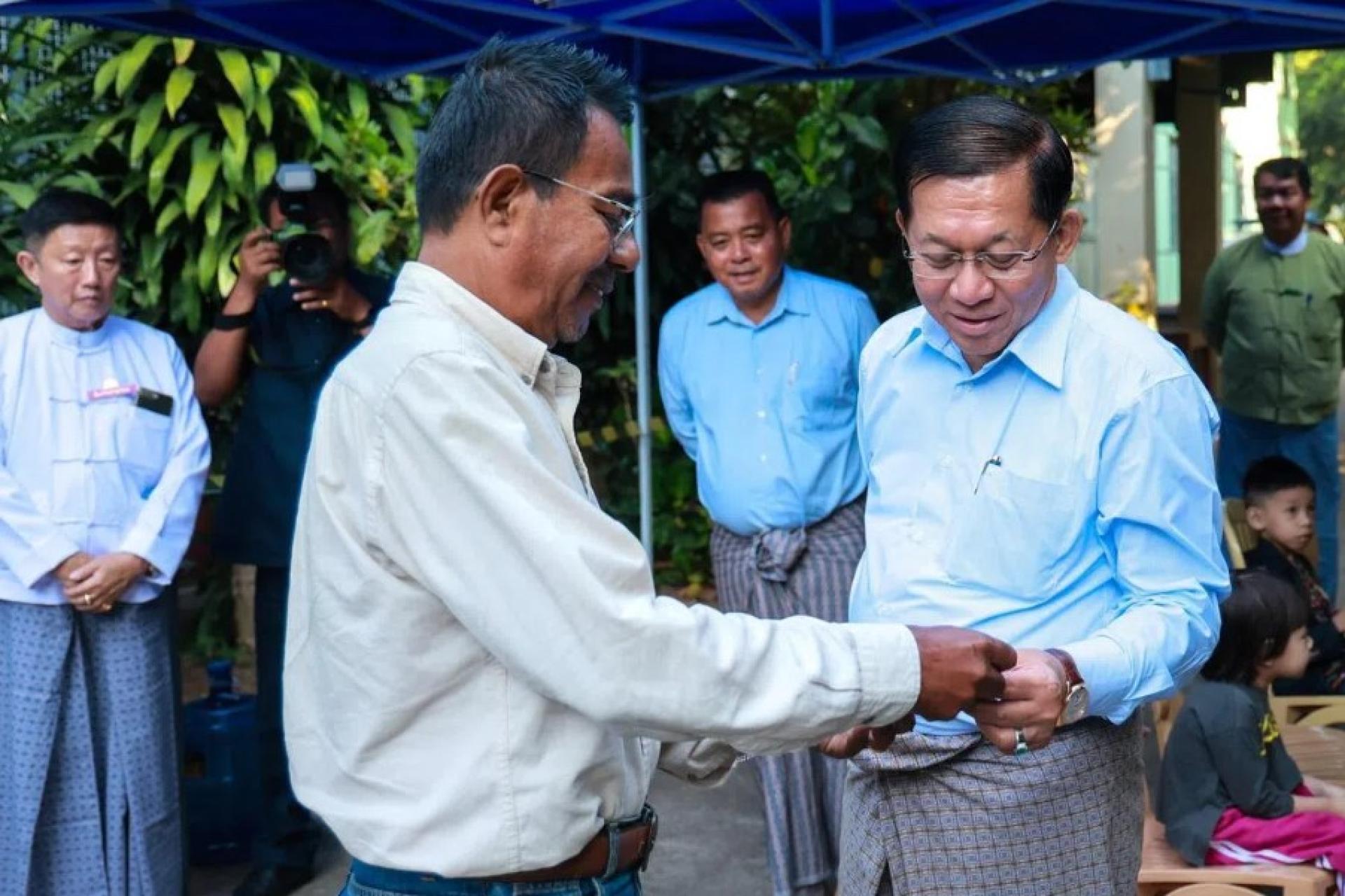 1月11日,缅甸军政府领导人敏昂莱(右)在仰光一个投票站外与一名男子交谈。