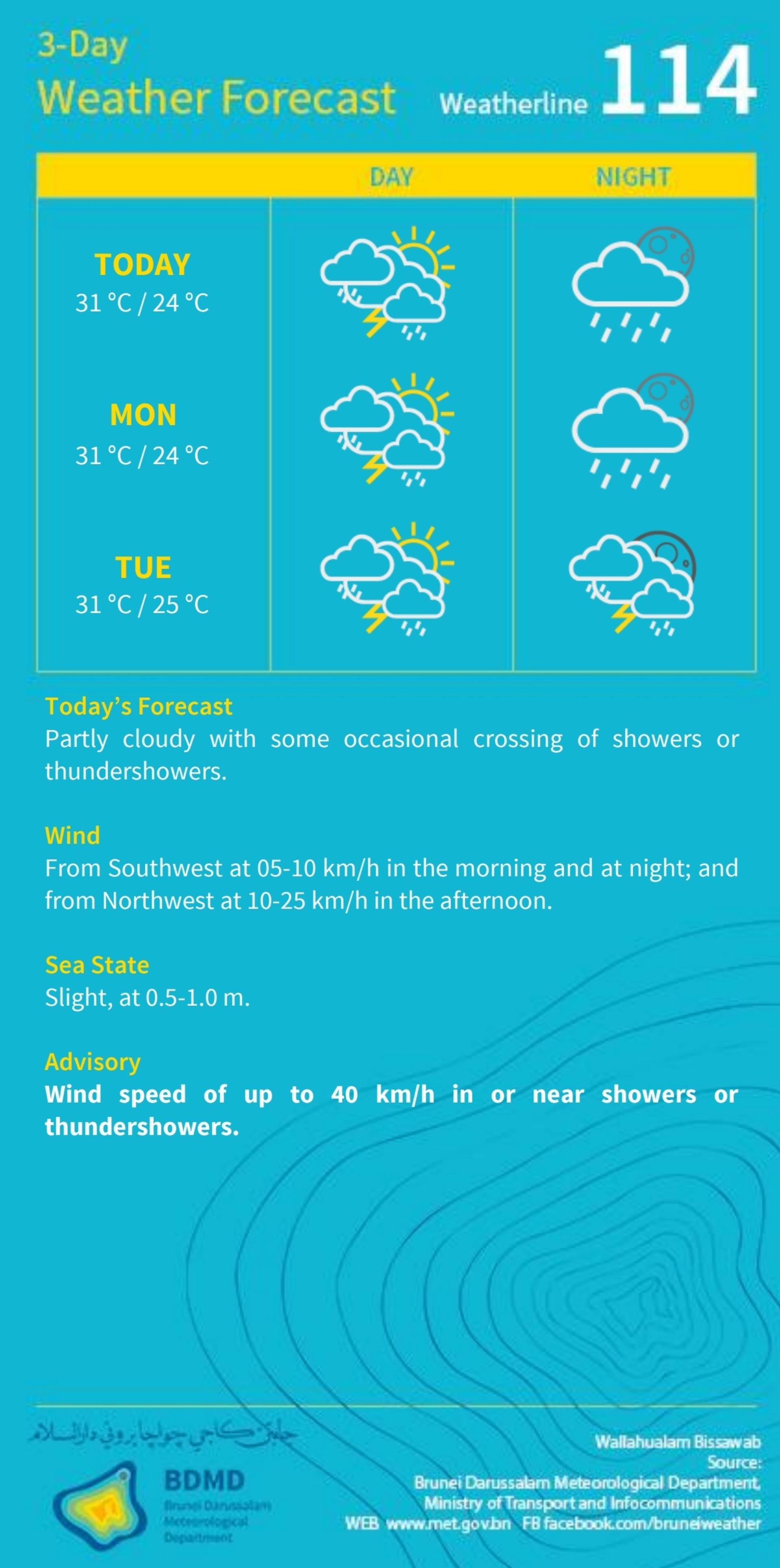(斯市17日讯)汶莱气象局今日发布最新三天天气预报,指出自2026年1月17日(星期六)起至1月20日(星期二),全国大部分地区天气以多云为主,间中将出现阵雨或雷阵雨。
